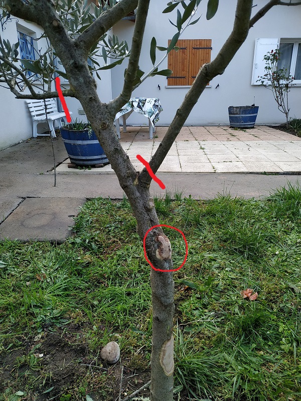 J'ai souligné/fléché mes 2 plus gros soucis; Le tronc en quasi angle droit la ou j'ai opéré l'"aberration" et une protubérance saillante résiduelle d'un trognon d'ancienne taille.