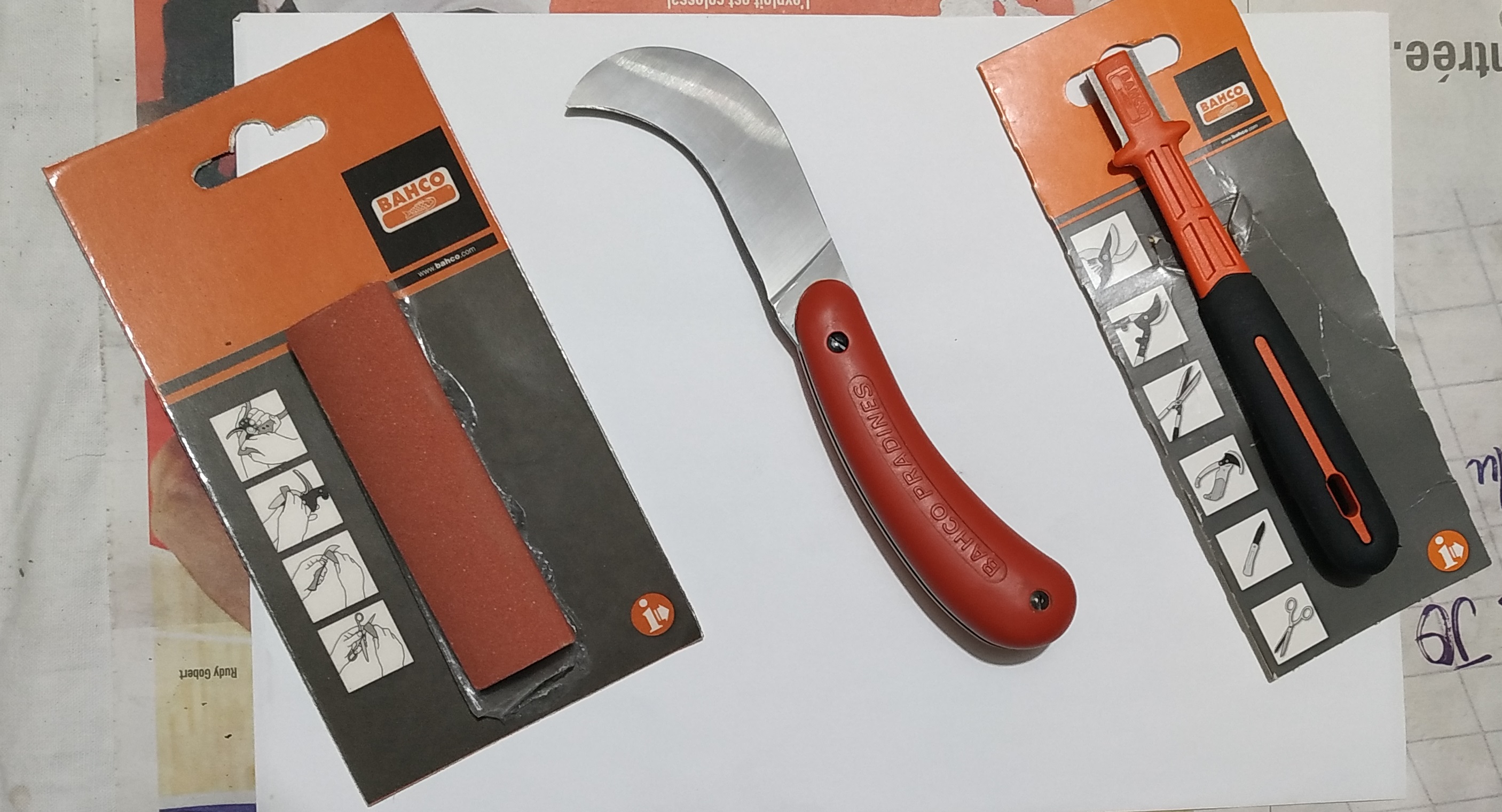 J'ai fait l'acquisition de la serpette P20 de Bahco. Et ce qu'il faut pour affuter et désinfecter.