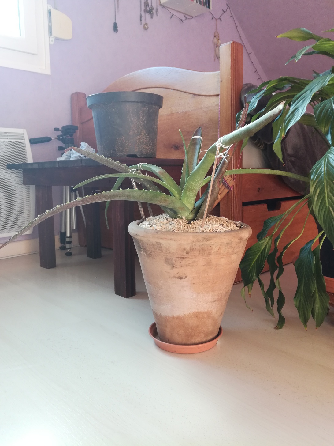 Aussi, avant de m'avoir été offerte, cette Aloe se trouvait sur en hauteur à côté d'une fenêtre ; elle ne recevait donc jamais de soleil direct. Il me semble aussi qu'elle n'avait pas été arrosée depuis août.