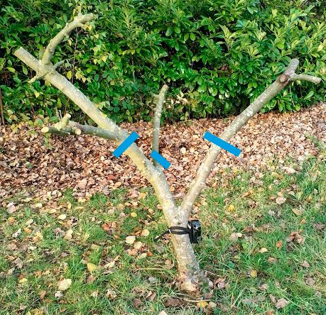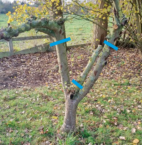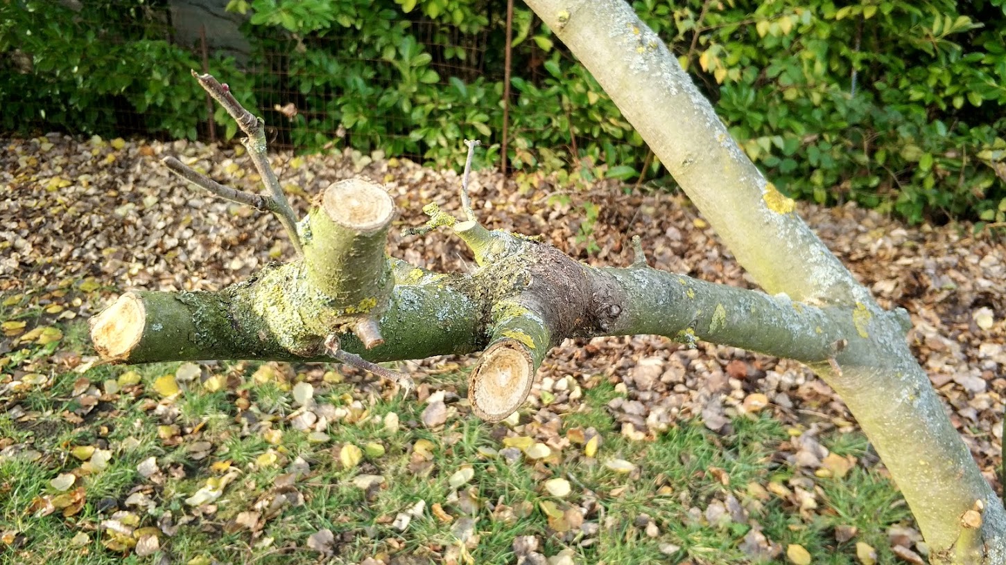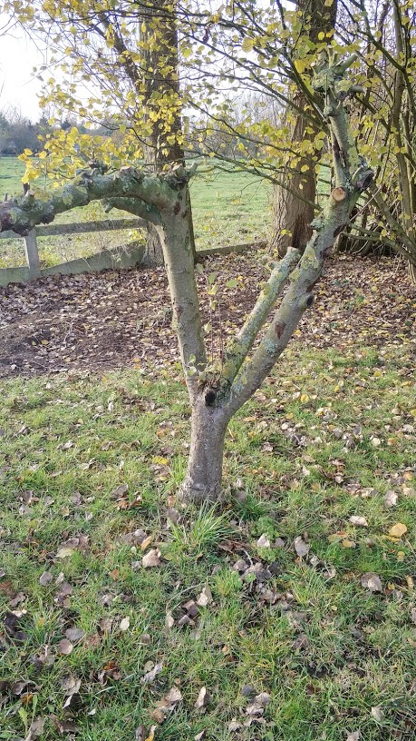 Pour la greffe en couronne, je pensais à un truc comme ça, en laissant deux charpentières sur chaque arbre. Vu que je vise l'acquisition de pratique, ça me ferait 4 charpentières à greffer en tout, ça me semble jouable, à 3 ou 4 greffons/chapentière comme dans cette vidéo ici.