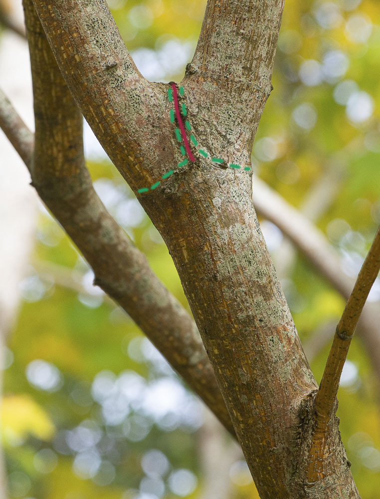 Ce coude n’est pas à interpréter, mais il va me permettre d’observer autre chose . En haut, entre les deux branches, les deux anneaux se touchent, tu remarques une crête de petits morceaux d’écorce et ce contact descend. Derrière cette ligne, à l’intérieur du bois, les deux anneaux l’un contre l’autre créent une zone d’écorce côte à côte ; sur quelques centimètres le bois des deux branches se touche sans être soudé. C’est ce que l’on appelle de l’écorce incarnée. (ce sera illustré dans le prochain sujet, mais comme l’origine du phénomène n’y est pas décrit, je le fais ici).