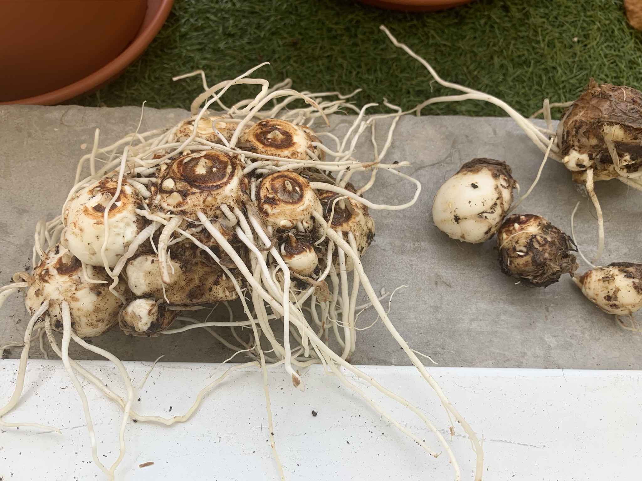Cepedant, mes bulbes ont beaucoup grandi. Je ne suis pas un expert, cette année c'est ma première en jardinage. J'ai vu alors que mes bulbes ont sorti d'autres bulbes - plus petits, comme des bébés -. Quelqu'uns sont encore collés au bulbe principal et il y en a d'autres qui se sont complètement déttachés. J'en ai planté trois, et regardez sur les photos combien elles sont maintenant.