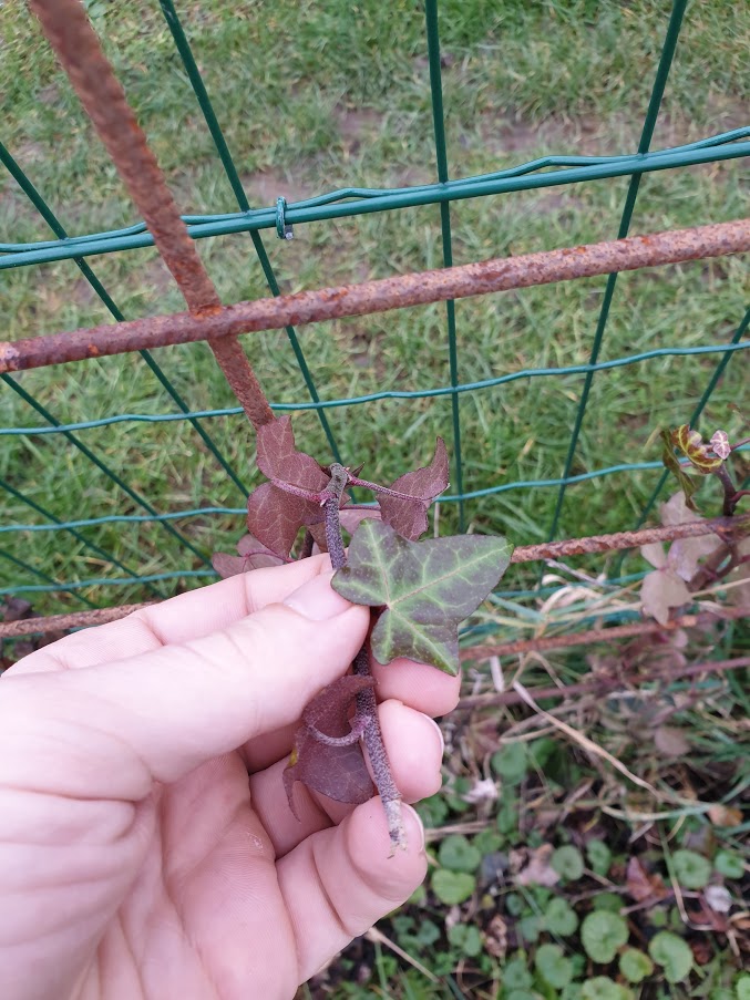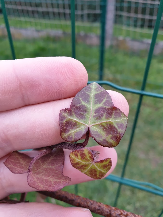 Peut-être que c'est tout à fait normal en hiver vu la jeunesse du lierre et qu'elle récupérera des couleurs au printemps, peut-être est-ce une question de variété (je ne sais pas de quelle variété il s'agit). Ça me fait penser à un symptôme de carence, ça pourrait peut-être être logique si on considère qu'ils n'ont pas encore fait des grosses racines. Mais alors, je ne sais pas quel élément apporter au sol.
