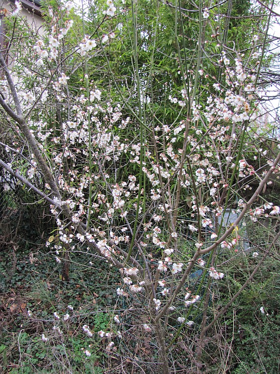 Une photo du mien : les pousses vertes font plus de 3 mètres de haut, le "bouquet de fleurs" aux alentours de 2 m. Je me posais justement la question de savoir si je ne devais pas tailler ces pousses très vigoureuses à 2-3 yeux : je crois que je vais le faire, et tenter de bouturer les tailles, on verra bien. Le (M)Ume n'a pas la réputation d'être facile ni à bouturer, ni à marcotter...