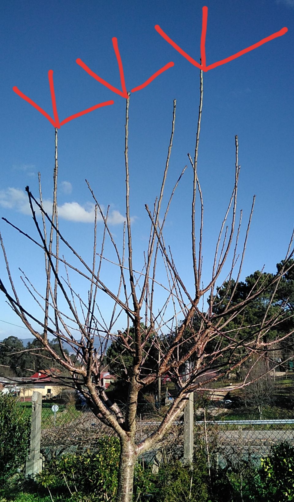 Hélène la Galicienne, les brindilles (de faible diamètre pour le moment) qui se croisent à l'intérieur peuvent être supprimées à la fin de cet hiver là, lorsqu'il n'y aura plus de risque de gelées. Concernant les charpentières bien plus grosses qui montent verticalement, je laisserais deux fourches se créer (dans deux ans environ ...) avant de les rabattre afin qu'elles ne montent pas trop haut. Donc en résumé : contrairement aux brindilles citées plus haut, l'idéal pour les charpentières serait de les tailler après la cueillette des cerises, vers fin Juillet c'est très bien. Il faut comprendre que pour le moment ce petiot est juste au stade de la taille formation. Fais ainsi et fais-nous des tofs.