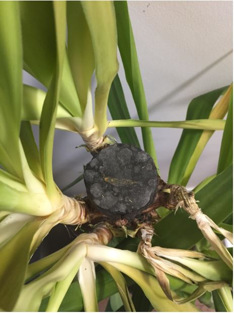 Je l'ai sorti de son panier en osier qui est intérieurement recouvert de plastique (pour éviter les fuites lors de l'arrosage). Il y avait des restes d'eau et je sais qu'un yucca ne supporte pas d'avoir ses racines stagnant dans de l'eau.