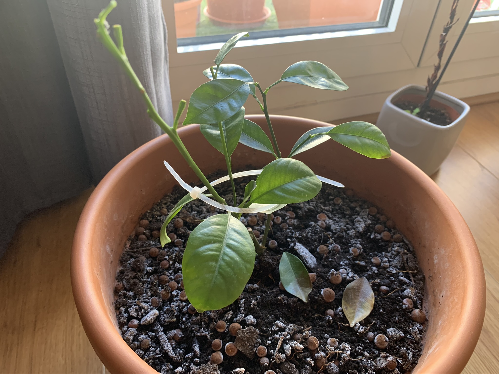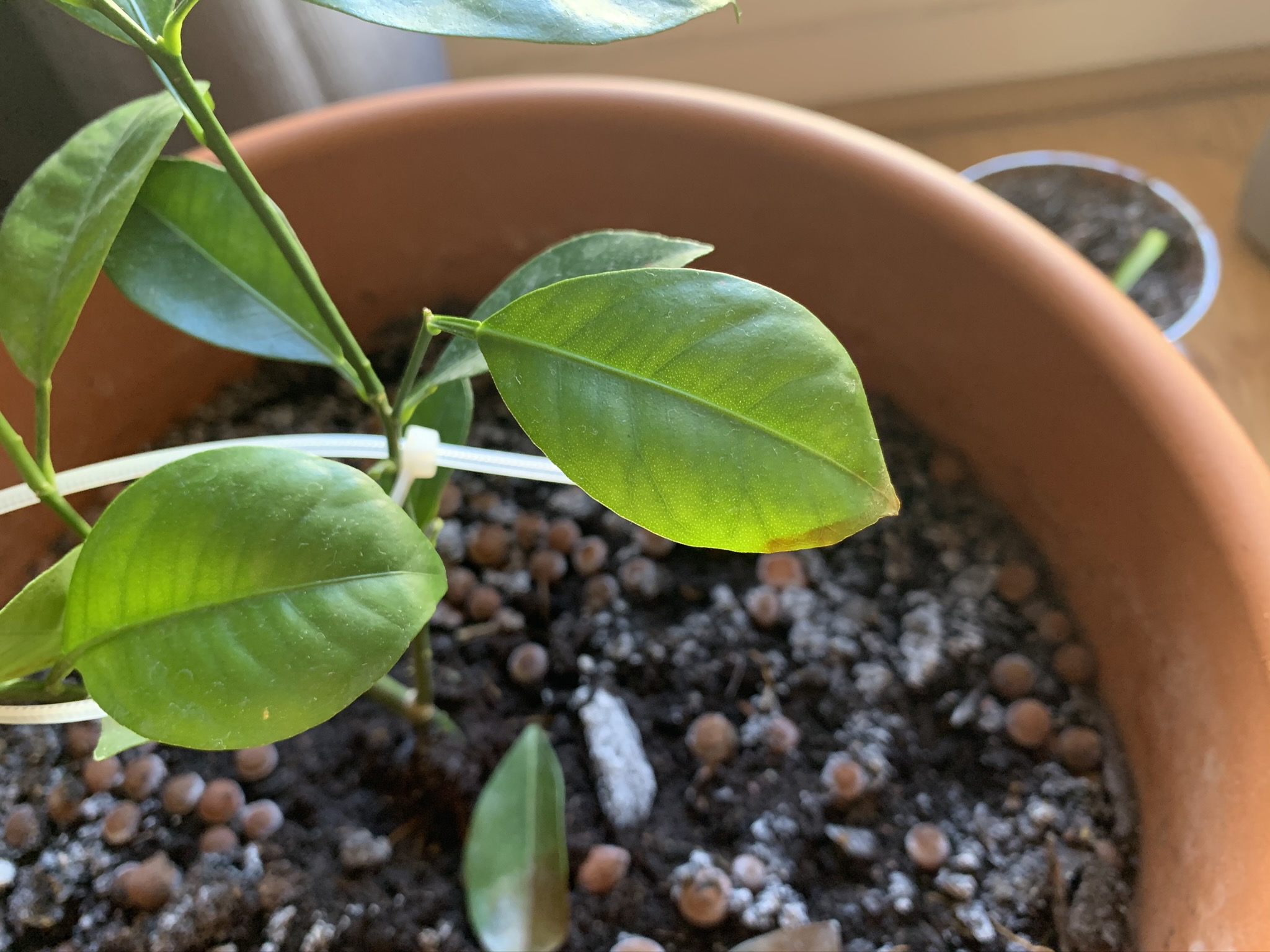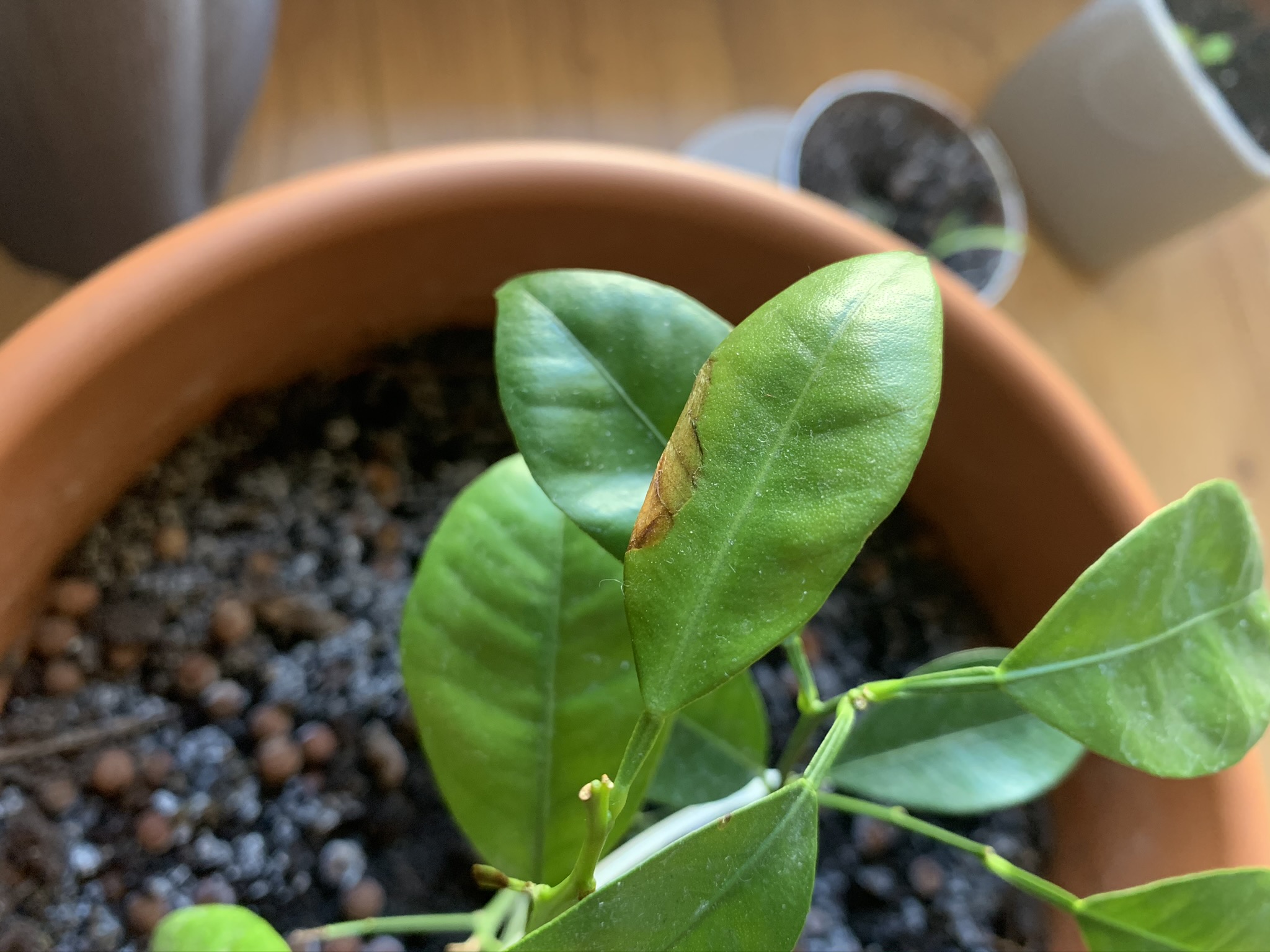 En avril 2019 j'ai planté un calamondin qui est resté pendant les mois chauds au balcon et puis je l'ai rentré pour la saison froide. Pendant les premiers jours à l'intérieur il a beaucoup poussé. Ensuite, pas de changement pendant deux mois et depuis il y a un mois, il brunit et perd ses feuilles.