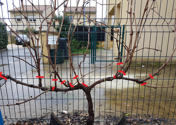 Maintenant que tes pieds de vignes sont bien installés, je te propose de passer sur une taille en Cordon de Royat, plus simple à réaliser en laissant des coursons sur les branches charpentières.