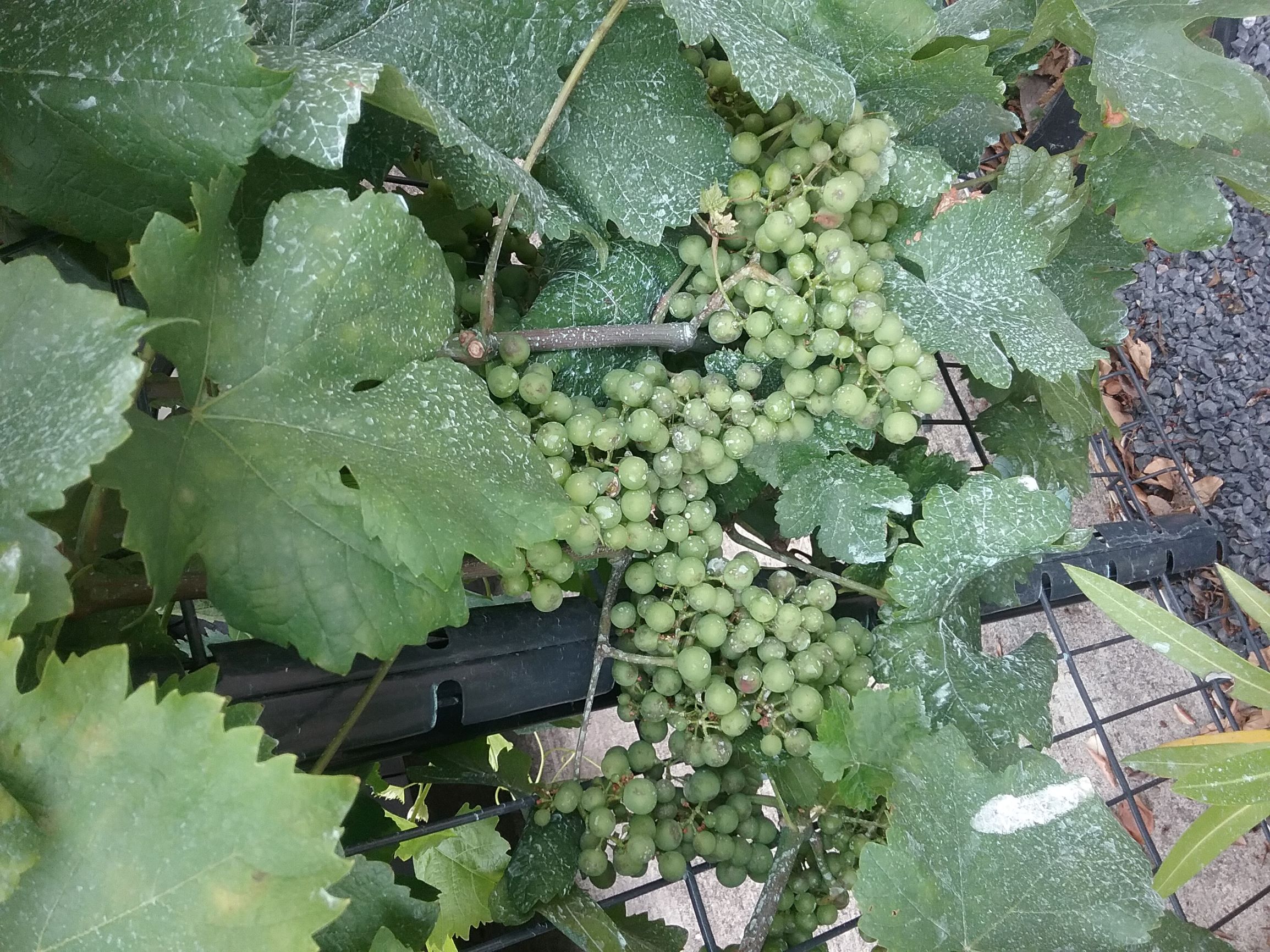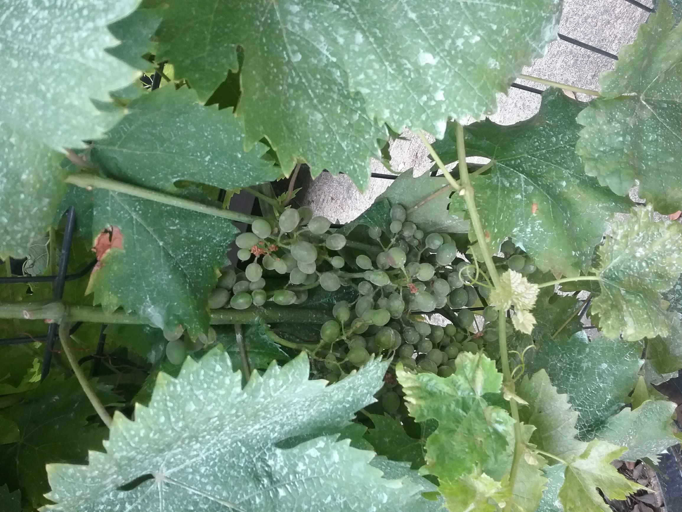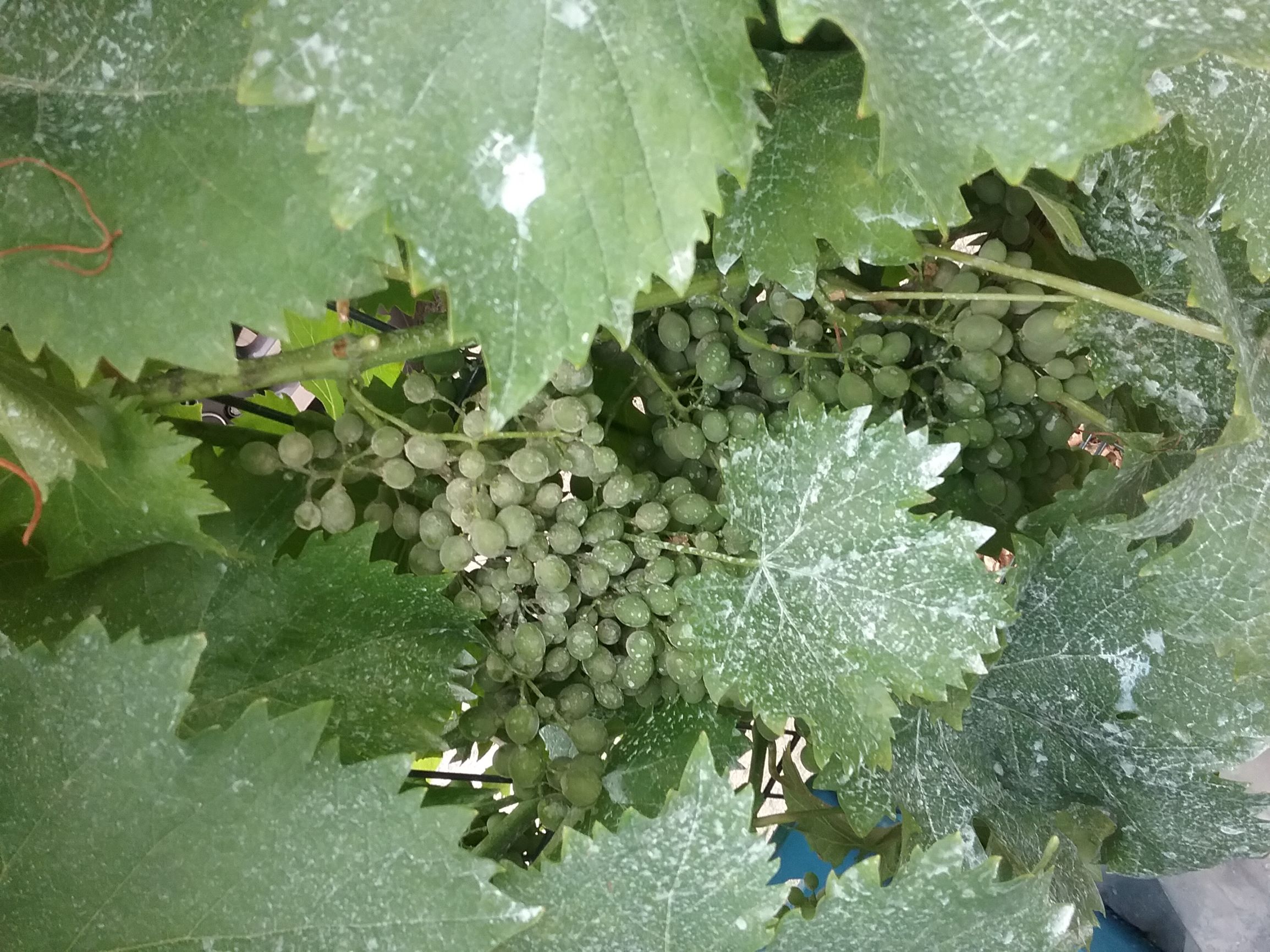 Pour les traitements dès le début du mois de mai tu traite tous les 8 jours avec un mélange de Bouillie Bordelaise (Contre le mildiou) et de souffre mouillable (contre l'oïdium).