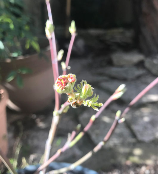 J'ai oublié de préciser le nom des Acer concernés : donc 'aconitifolium', 'katsura', 'orange dream', 'Wilson's', 'momoiro koyasan', 'shishigashira' (le dernier sur les photos, un sujet qui va vers ses 8 ou 9 ans). Mais 'butterfly', 'beni hagoromo', 'koto no ito', 'ariadne', 'oridono nishiki' et quelques autres ont leurs bourgeons près à éclater… J'espère qu'avec le froid annoncé pour quelques jours tout ce joli monde va se calmer !