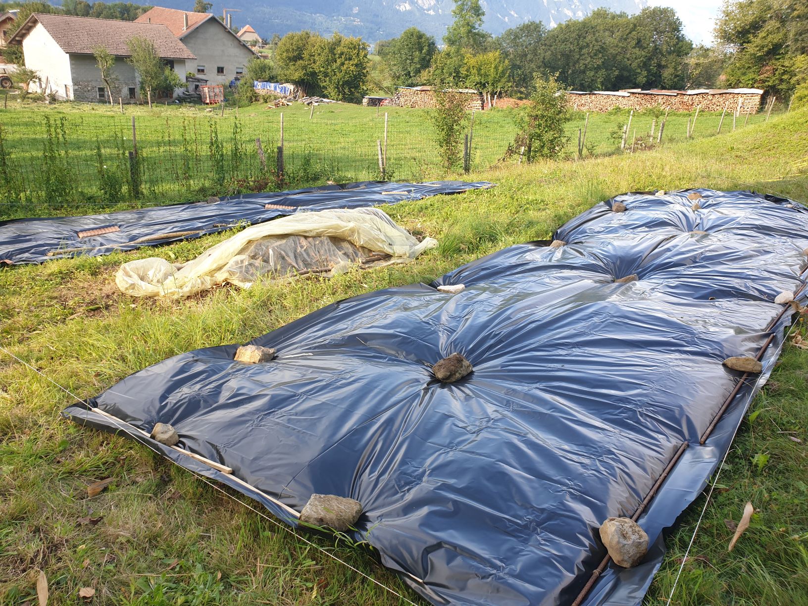 Le jardin ressemblait à ça! La première étape à été de bâcher 2 parcelles de 3*9m le 13/08/19 afin de priver de lumière et de "thermiser" l'herbe. La tonde du gazon, la taille des haies qui avait été négligé par les anciens occupants et les déchets de cuisine alimentent les composteurs qui seront rapidement saturés.