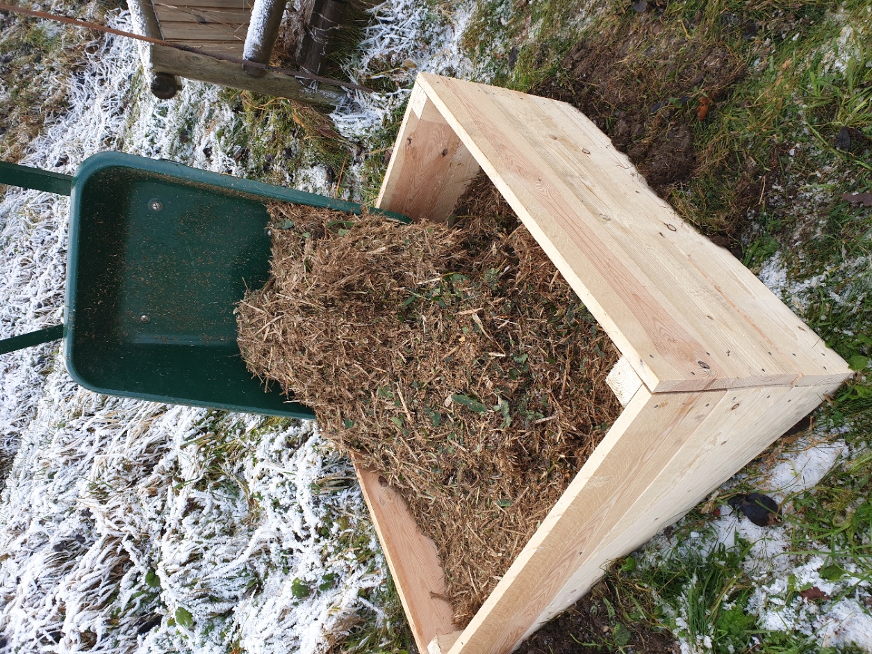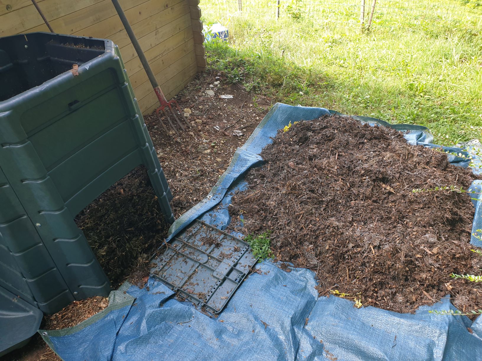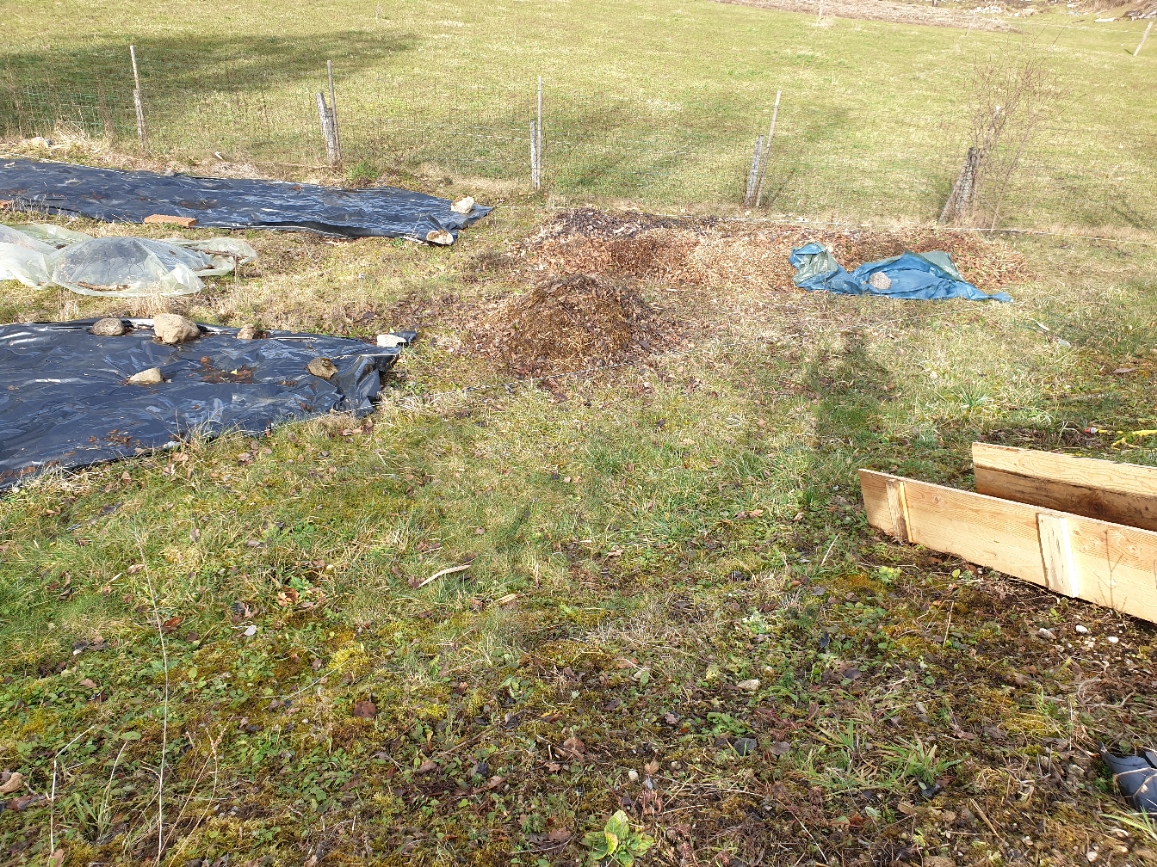 Je vais épandre petit à petit la matière sèche que j'ai stocké sous forme de paillage. En faire du compost dès que j'aurais des tontes à mélanger.