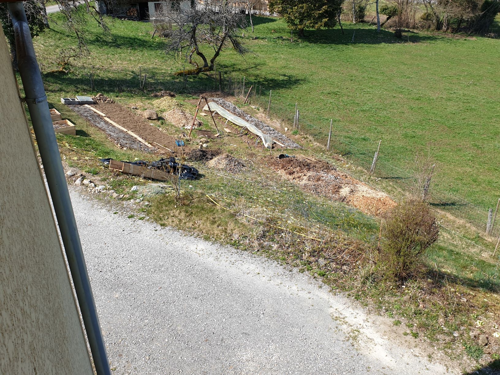 Je fais quelques aller-retour pour chercher du fumier. Pour l'instant il est tout frais. La douceur et le vent de ces derniers jours ont fini de faire fondre la neige. Je vais bientôt débâcher pour préparer le sol. J'irai chercher du fumier plus vieux pour l'incorporer directement à ma terre.