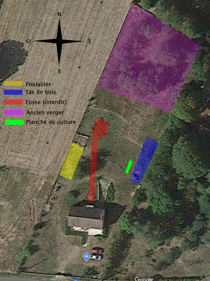 En jaune c'est le poulailler, il peut être déplacé, d'autant qu'il y a un mois les poules se sont toutes faites bouffer par une belette (ou une fouine on ne sait pas vraiment). Devant le poulailler il y a un cerisier (qui donne plein de cerises...immangeables aussi sic :/ )