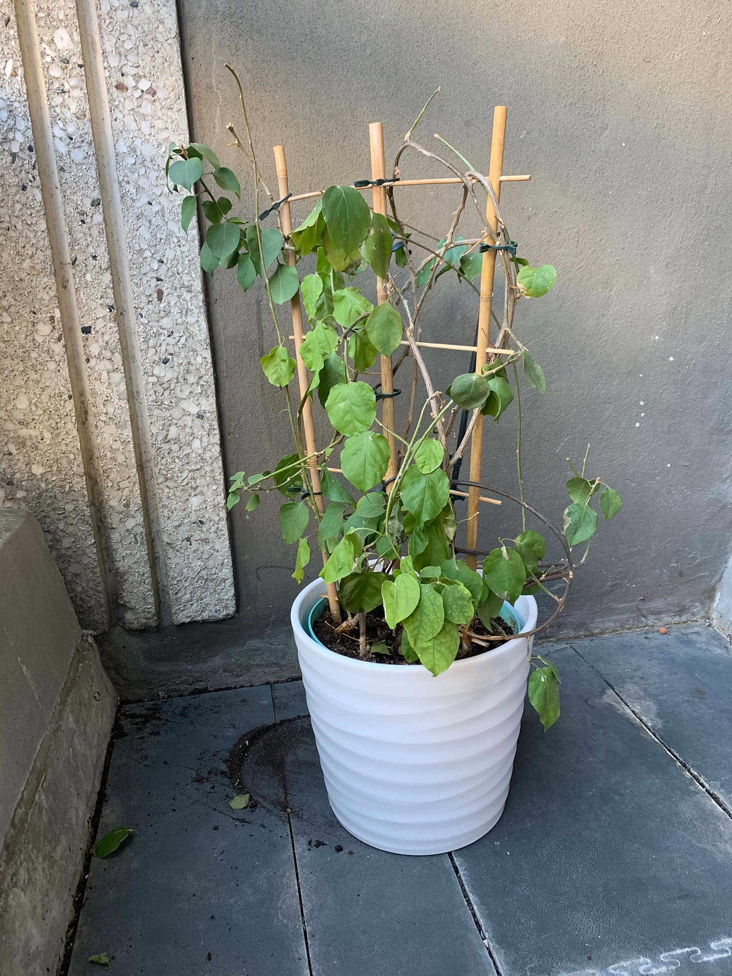 Mon bougainvillier a passé l'hiver sur mon petit balcon (à Paris), et depuis il a perdu ses feuilles...