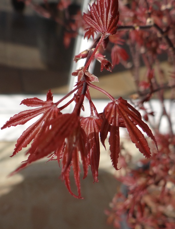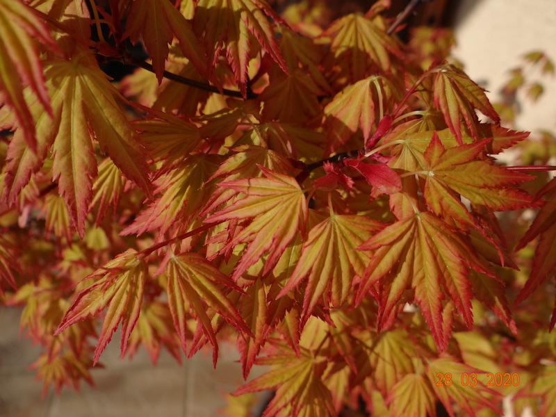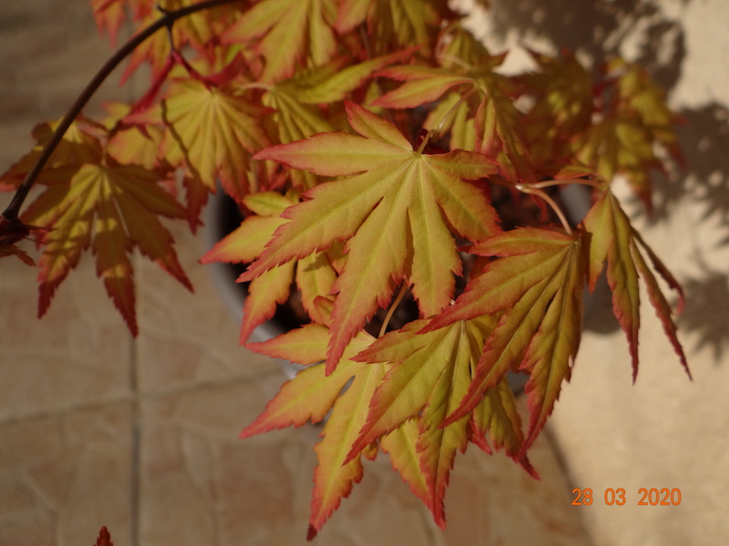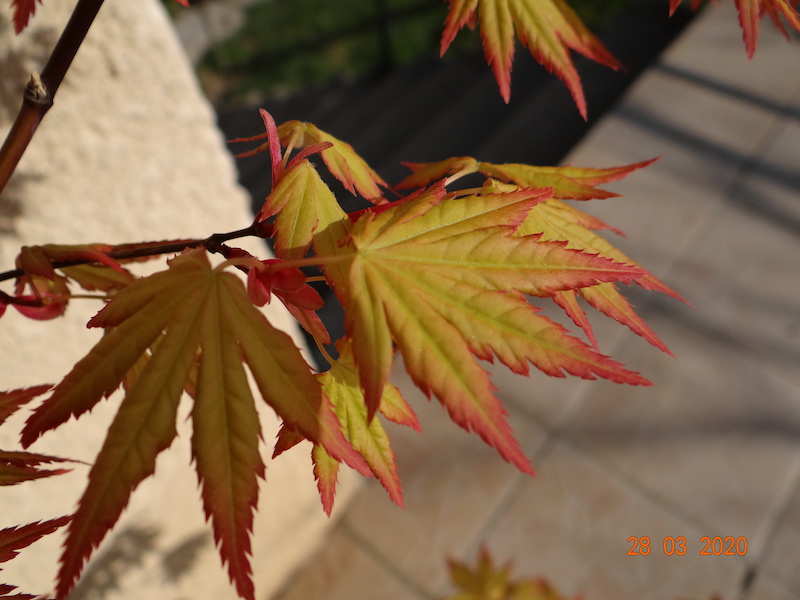 J'ai remis Sangokaku sur la terrasse qu'il illumine littéralement, j'en suis très content. Il a pour l'instant résisté, le long d'un mur, à un hiver très pluvieux, il a résisté à des gelées matinales très fortes (-4 et du vent) sous abri de fortune et avec ses feuilles sorties! Les seuls dégâts au feuillage ont été liés aux déplacements que j'ai du opérer dans des conditions hasardeuses...