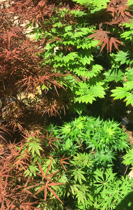 Oui, je rentre tout le monde, sauf bien sûr les gros sujets qui n'ont pas encore débourrés (ceux-là sont sur la terrasse) et ceux plantés en terre, car j'ai réalisé l'automne dernier quelques massifs, avec des associations de couleur, forme et hauteur : tous les Shirasawanum, 'trompenburg pourpre', 'butterfly', 'tana', 'saku', 'les shigitatsu sawa', 'osakazuki akane', 'viridis', 'japanese sunrise', etc... Je vous laisserais juge du résultat : rien ne dit que je ne ferais pas évoluer ces massifs, un Acer se plante et se déplante très facilement...