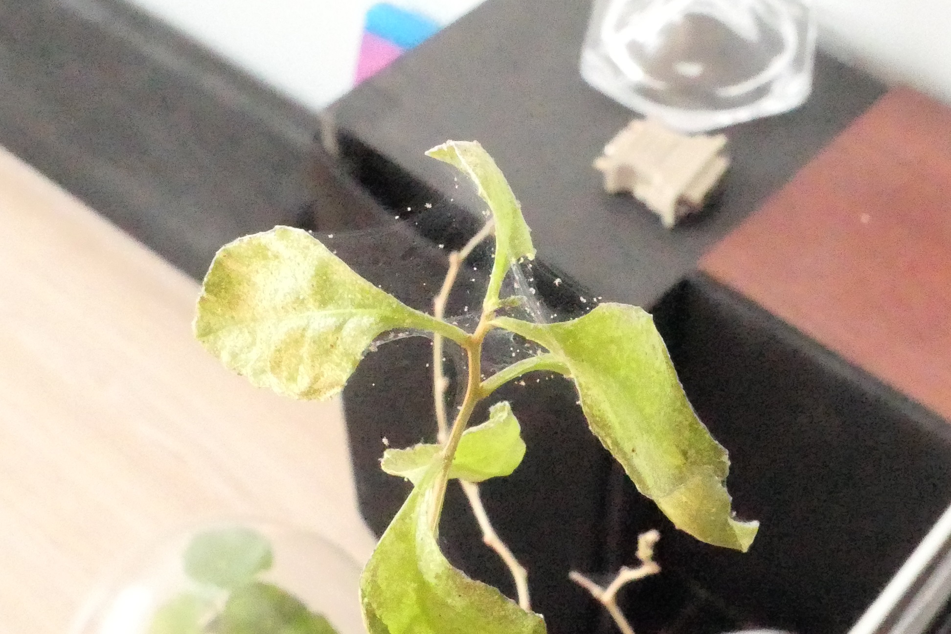 Depuis peu, j'ai remarqué des étranges toiles sur le bout des branches / feuilles, mais c'est tout petit. J'imagine que ça fait un bout de temps que c'est là, aussi je pensais à rien de méchant. J'avais nettoyé et je pensais que c'était juste de la poussière. Mais c'est revenu et là, j'ai décidé de prendre l'appareil photo numérique pour zoomer à fond, et j'ai vu des petites bêtes vertes.