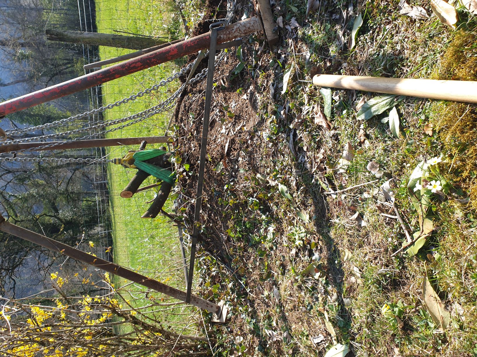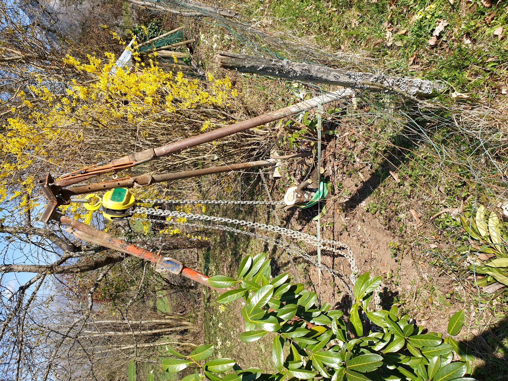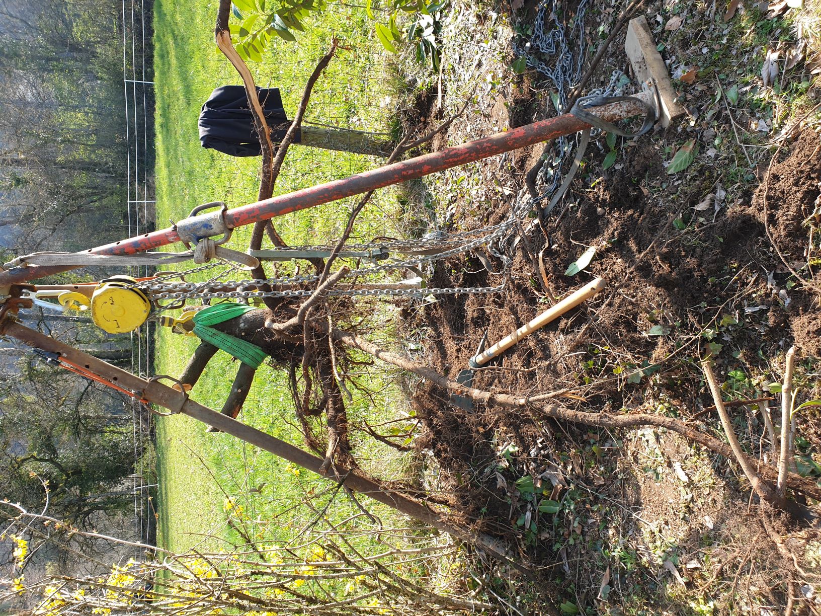 Mise en place du palan. Bien d'aplomb, Bien dans l'axe de la souche.