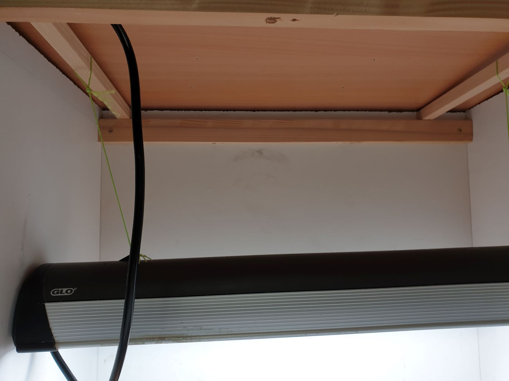 La ventilation nécessaire au refroidissement des néons et à la croissance des plantes se fait naturellement grâce au trous du fond (ventilation basse) et au panneau coupé plus court en haut (ventilation haute).