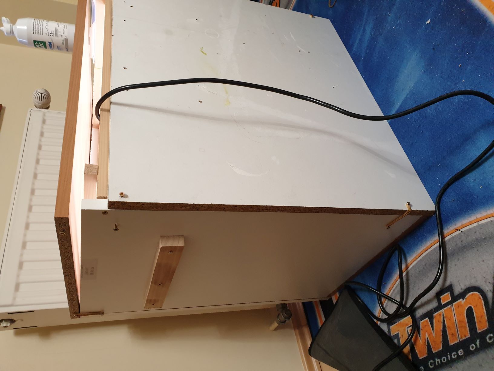 C'est un bricolage tout à fait basique à base de tablettes et plateau mélaminé ainsi que de tasseaux dont j'avais des chutes.