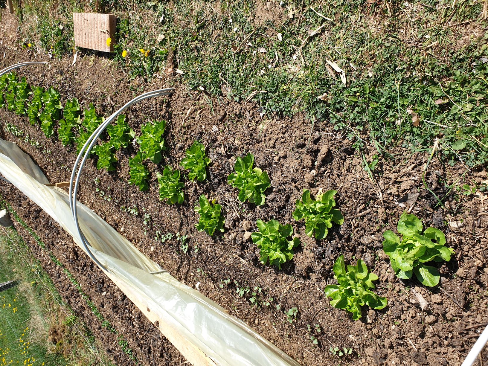 Une moitié est dehors sous le tunnel. L'autre toujours à l'intérieure sous ma lampe. Les laitues commencent à pommer. J'ai réalisé différents semis: