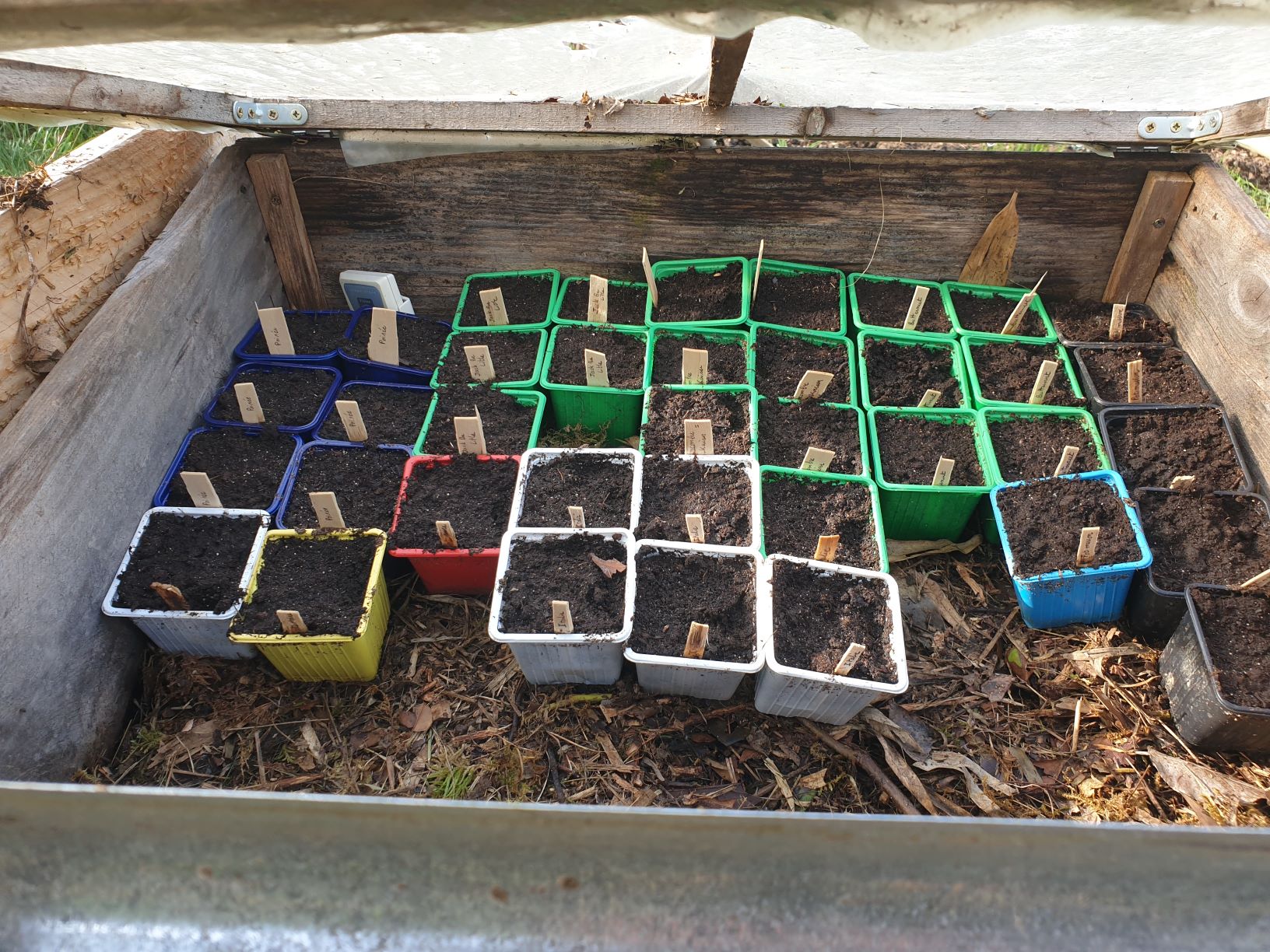 Les pois nains son ramés. Les pommes de terre montrent leur nez. Je vais surveiller et les recouvrir. Et c'est bientôt bon pour les radis! La semaine dernière j'ai reçu ma commande de graine. Du coup j'ai semé des épinards "monstrueux de Viroflay"