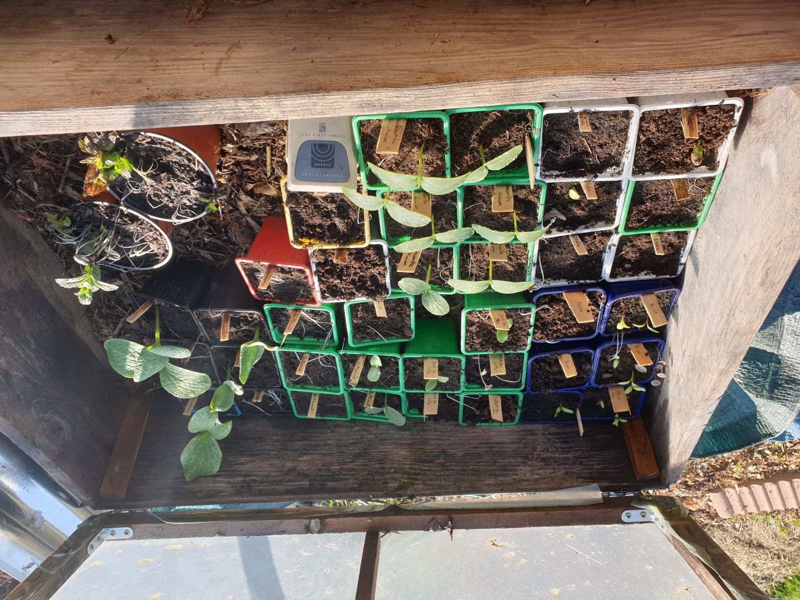 Les concombres en seulement 2 jours. Suivis des poirées et des potimarrons. Ces derniers ont d'énormes cotylédons et leurs racines transpercent déjà les trous de drainage des godets pour s'enfoncer dans le compost chaud.