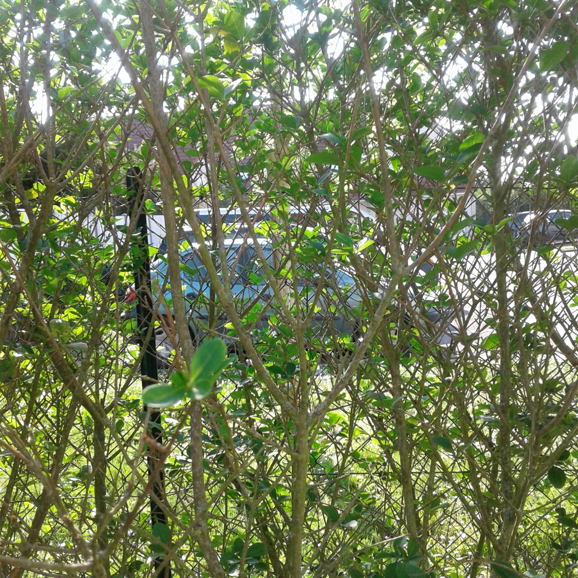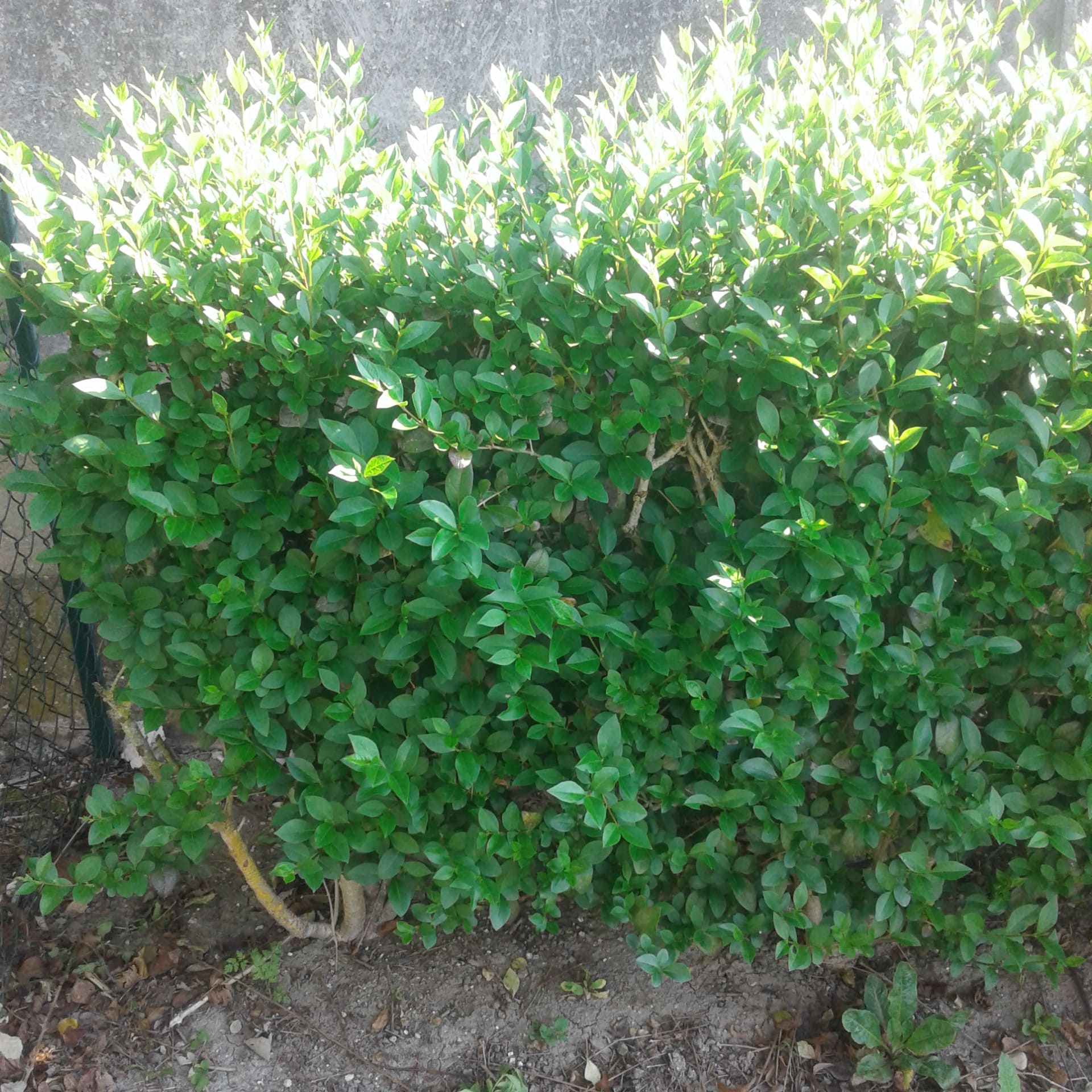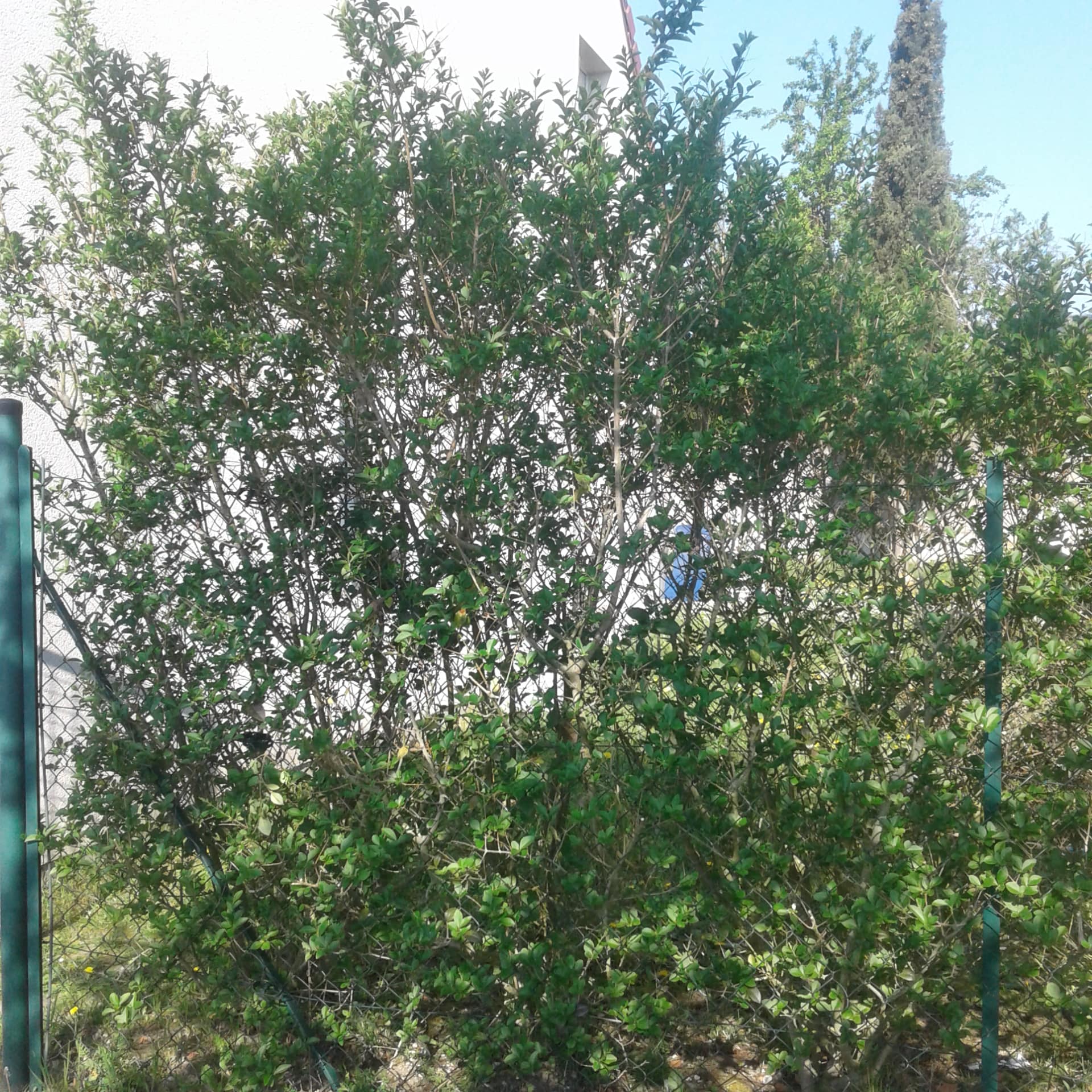 - juste en face de chez moi, il y a les mêmes troènes entretenus par les propriétaires du lotissement : ils sont bien fournis et bien plus verts que les miens, mais ils sont maintenus à une hauteur très basse (photo jointe également). Je crois qu'ils ne sont jamais arrosés. Je me dis que les miens pourraient tout à faire avoir la même densité puisque le sol et l'exposition sont les mêmes.