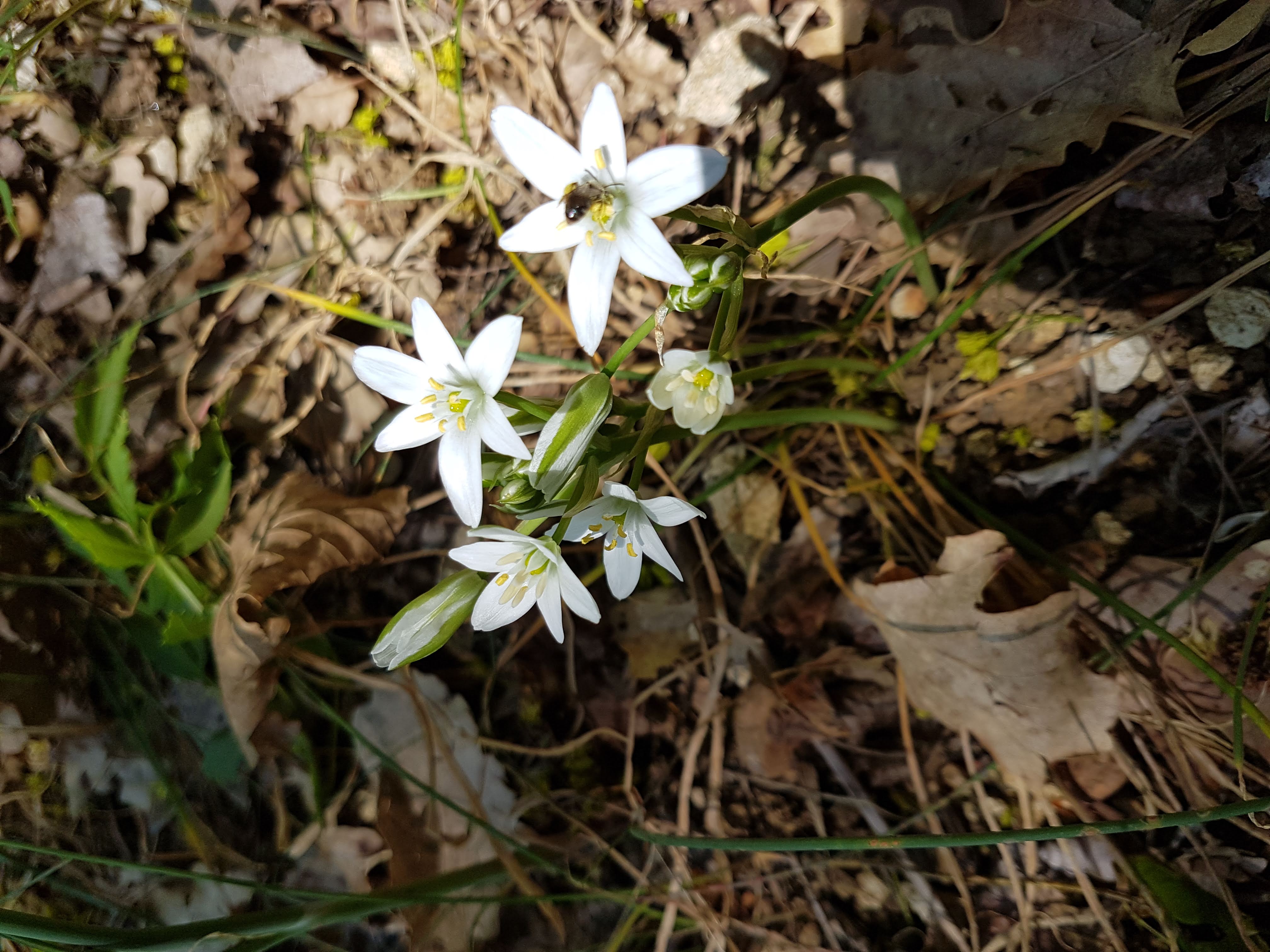 J'ai cette jolie fleur blanche qui pousse dans ma colline, plutôt en sous bois. j'avais espéré que ce soit de l'ail des ours mais les feuilles sont très minces, comme des ciboulettes et sans odeur d'ail. Les feuilles sont actuellement déjà presque sèches.