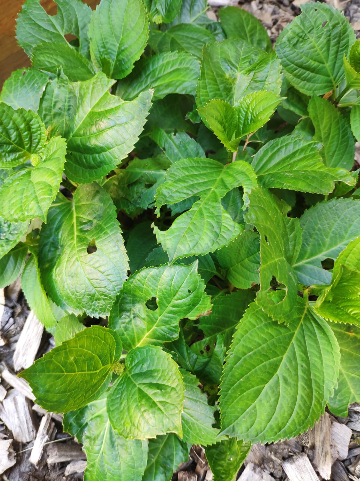 Un insect gourmand semble très friand de mes plantes (voir photos) et a commencé à ronger mes hortensias ainsi que mes petits rosiers. Le problème c'est que je ne vois aucun insect, ni limace ni rien d'autre.
