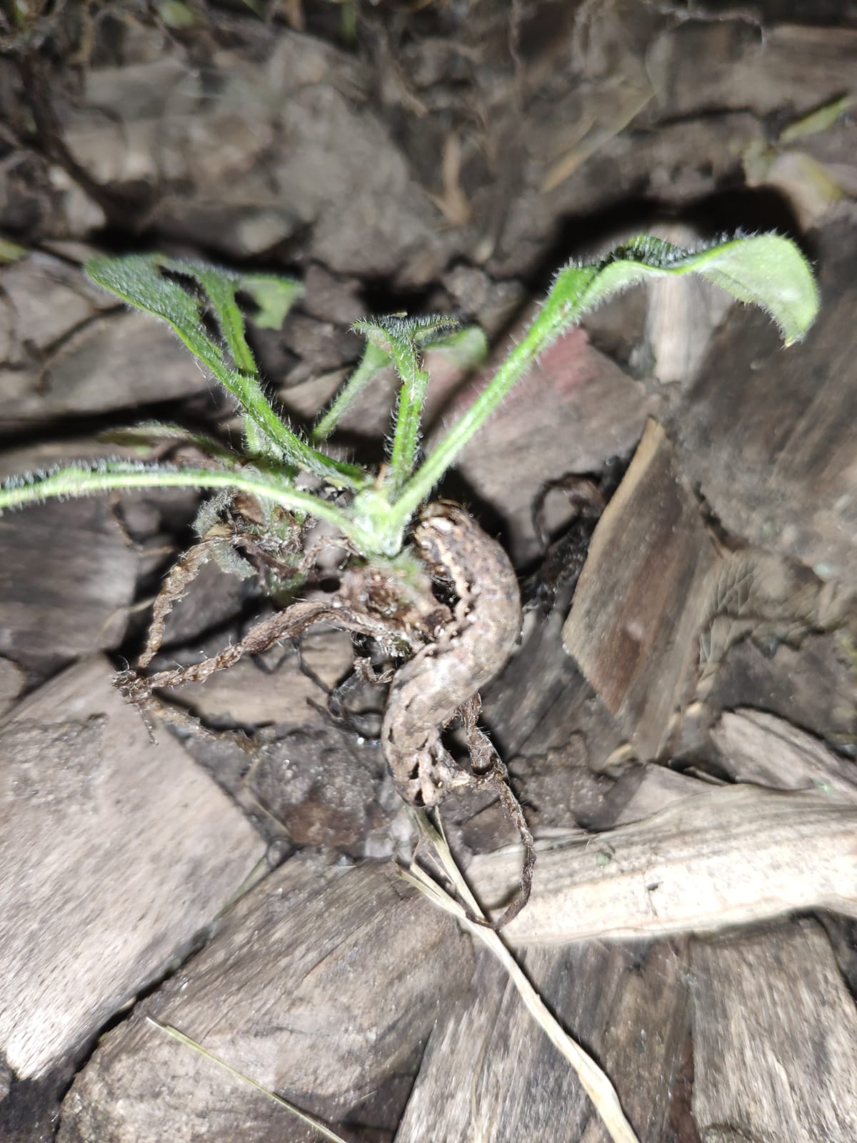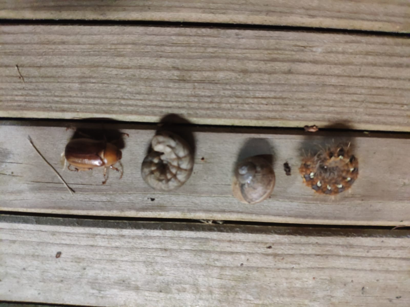 Un ver gris, une autre chenille qui a l'air urtiquante, une autre bestiole qui me semble être un hanneton et un petit escargot, tous trouvés en plein festin de mes miosotis et de ma glycine.