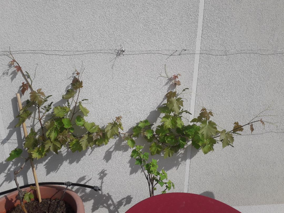 Une nouvelle photo de ma vigne qui pousse, pousse et pousse. En plus nous avons un beau soleil depuis plusieurs semaines ce qui aide! En voyant la photo, mon oncle m'a écrit " il te faut éborgner les rameaux latéraux, m^me s'il sont porteurs de mini grappes , pour que la tige principale croisse" .. Je voulais avoir vos avis. A t il raison ou est ce que je continue à la laisser croitre ainsi?