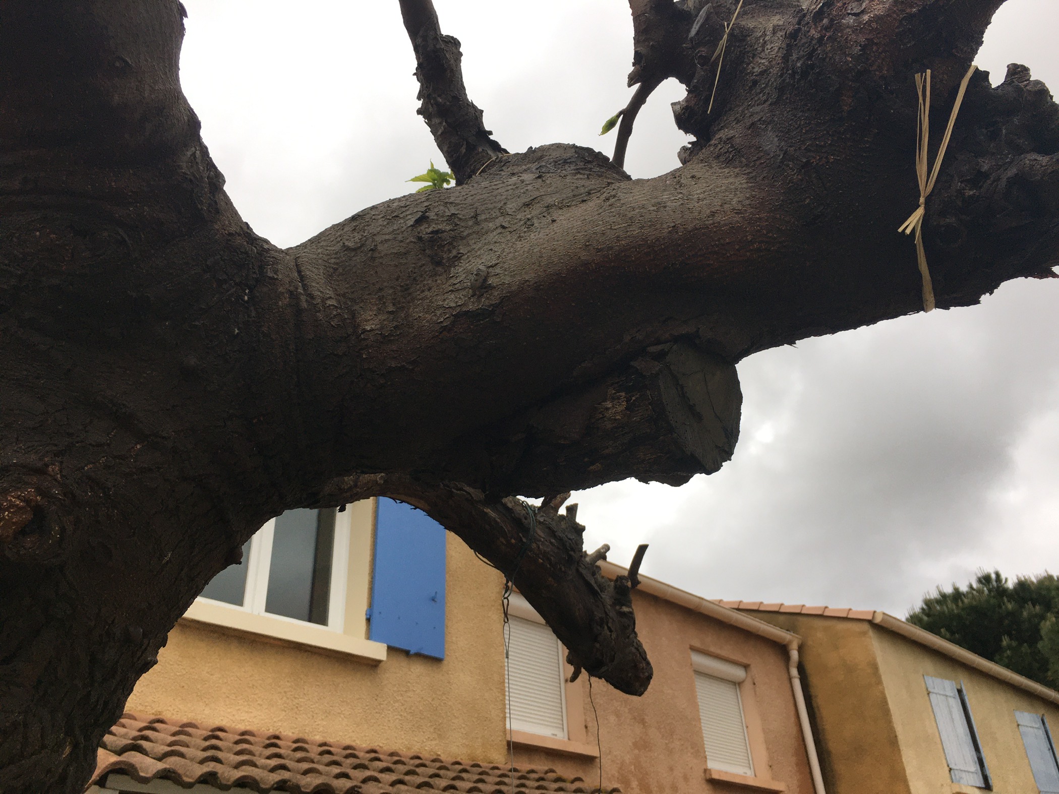Le soucis c est qu au niveau du tronc ( cercle rouge) il y a un trou d une 15 ene de cm de profondeur de bois plus ou moins pourri envahi par les fourmis !!