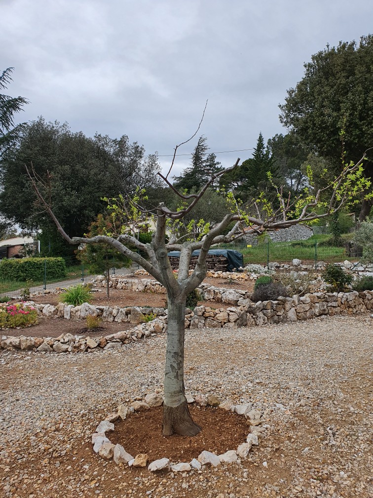 Bonjour. En effet c'est curieux ? Avez-vous vérifié l'état des bourgeons, verts, secs ? Sous l'écorce, vert ? Sinon, que c'est beau ce décors avec les pierre sèches, j'adore c'est typiquement méditerranéen ...