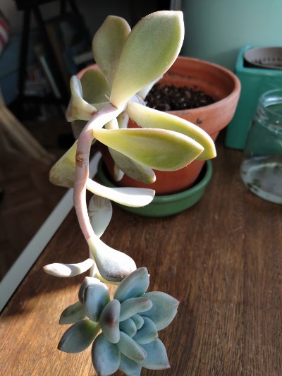 Mon echeveria était positionnée dans un endroit qui visiblement ne lui convenait pas, elle s'est donc étiolée. Maintenant qu'elle a trouvé emplacement plus lumineux, une rosette a fait son apparition en bout de tige. Ouf!