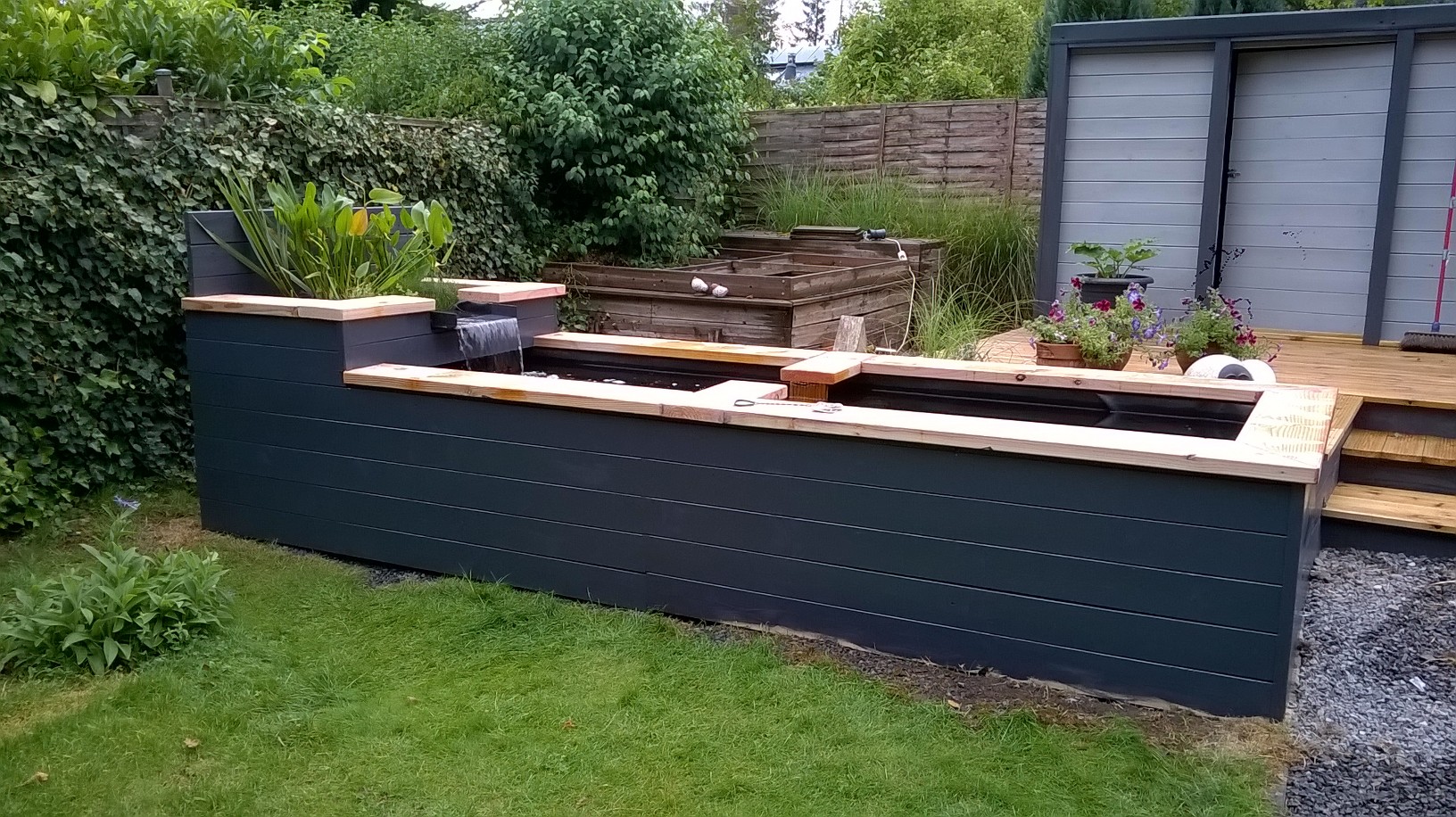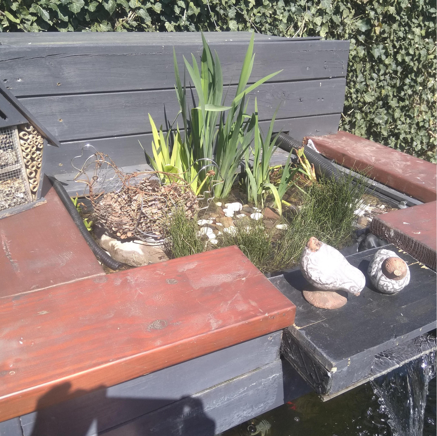 J'ai créé un bassin pour poissons avec un bac avec des plantes qui sont censées filtrer l'eau. (voir photo)