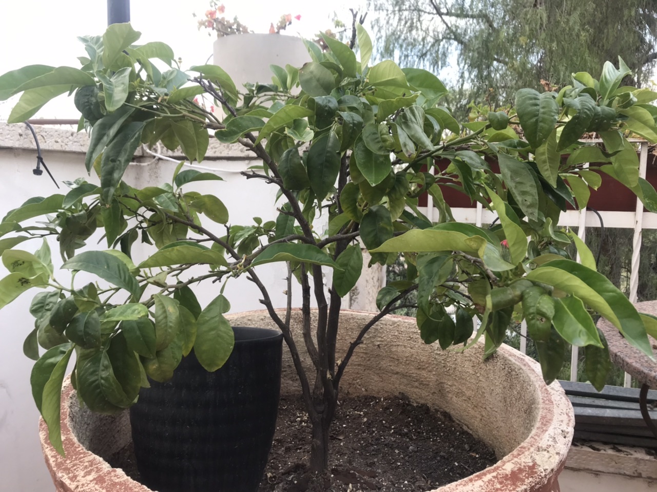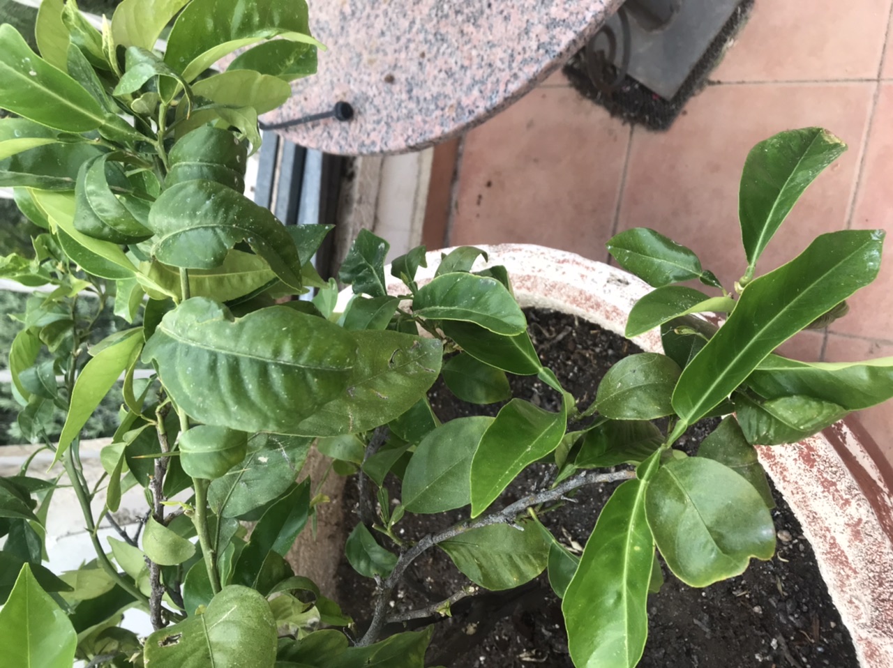 J’ai vérifié le pot qui est percé. En examinant les feuilles j’ai trouvé une remplie de larves de pucerons et des fourmis. J’ai donc aspergé le tout de savon. Je ne sais pas quel est le type de terre utilisé, néanmoins elle n’a pas été changée depuis au moins 14 mois. Il y a un mois, j’ai coupé certaines branches afin d’aérer le centre de l’arbre.