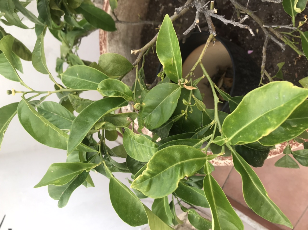 Aviamo nous a dit qu'il est un citronnier vert, donc peut-être un combava? Une fois les pucerons vaincus, et il a reçu un apport d'engrais, ça ira. Mais faut faire attention à l'arrosage quand même. Le pot est grand par rapport à la taille de l'arbre.