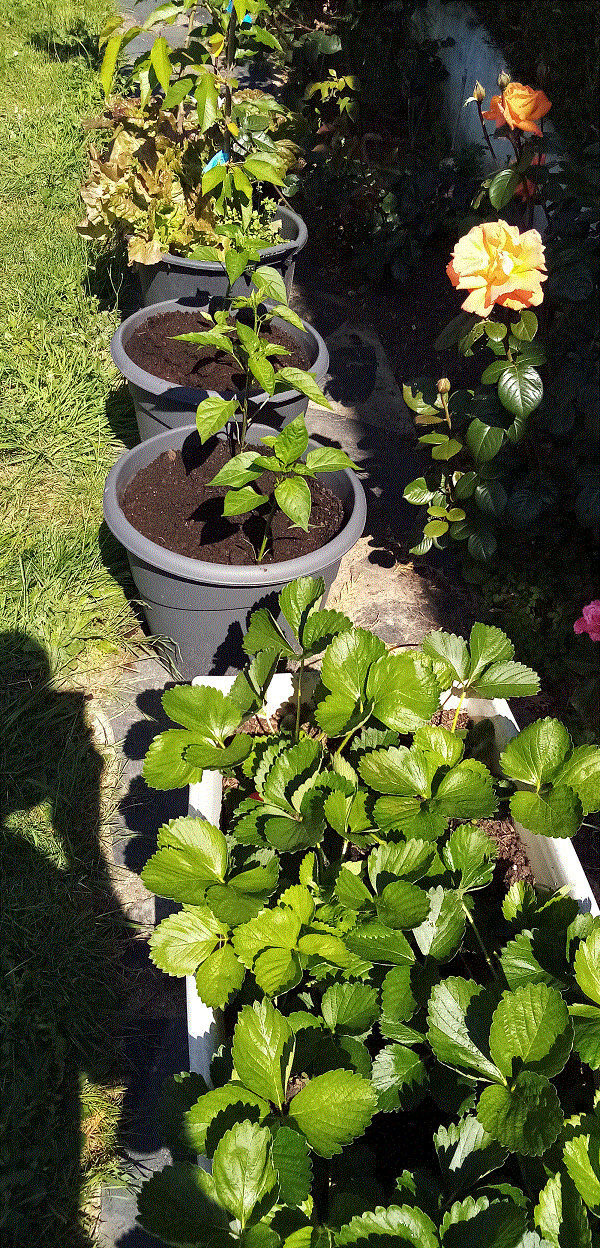 Et mes pots avec fraises, piment goria, potimarron et butternut dans un pot rempli de compost dans lequel je vais ajouter une patate douce.