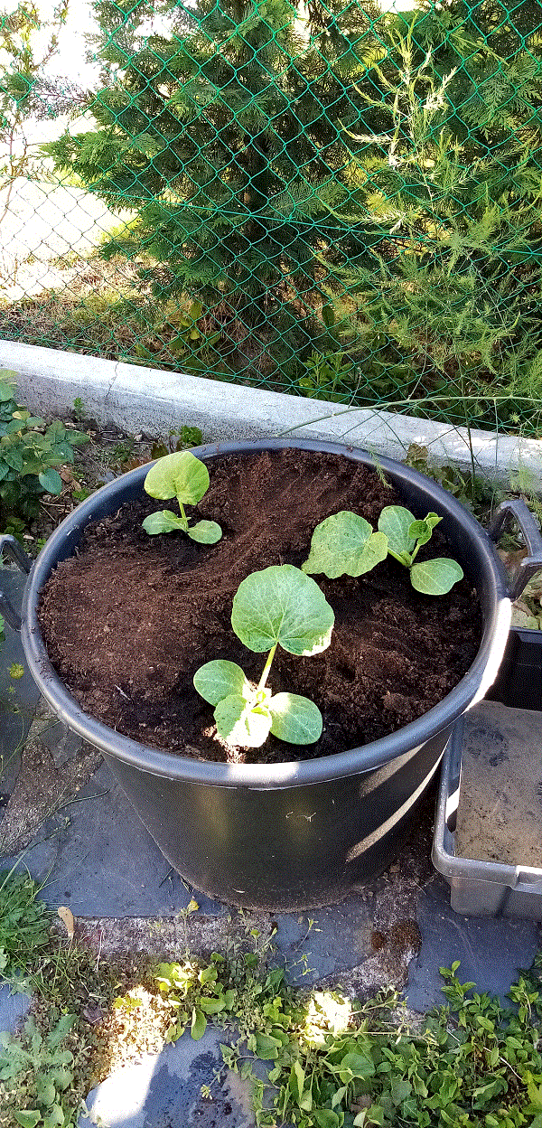 Les rattes avec derrière, 4 cousgettes, deux jaunes et deux vertes. A gauche le potager vertical avec 5 concombres, un potimarron, un butternut, des haicots à rame et deux patates douces à venir ( elle attendent de s'habituer au soleil)