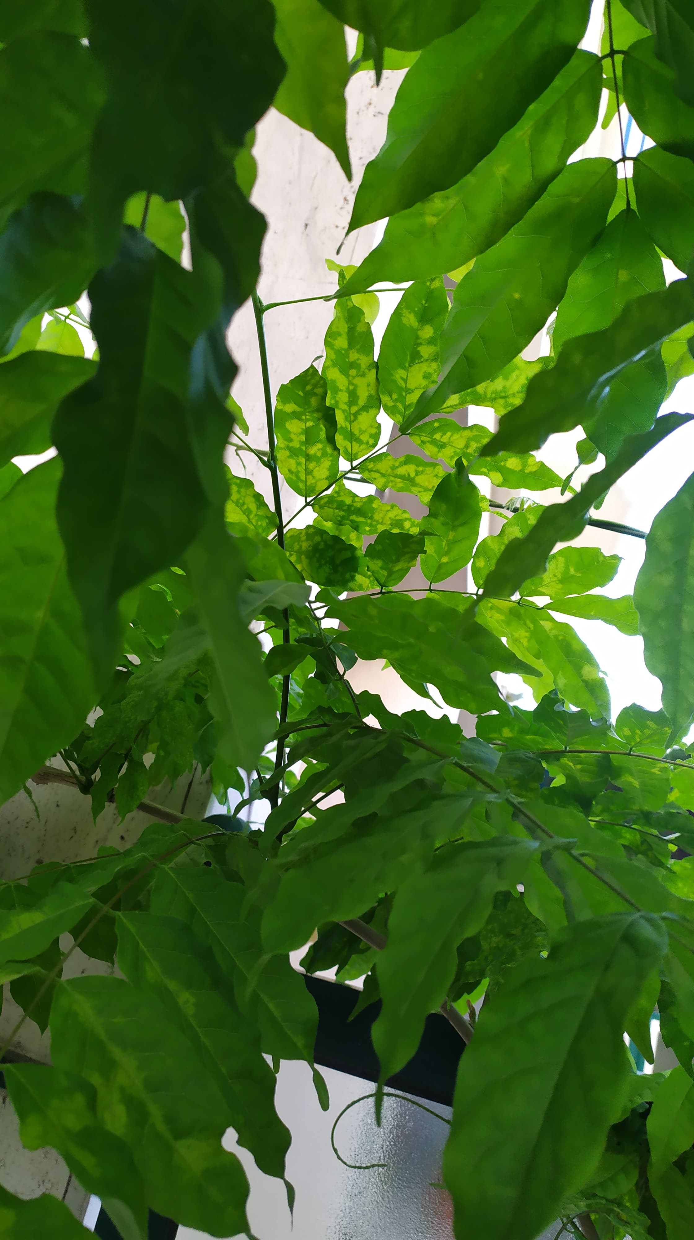 Chaque année lorsqu'elle pousse (très fortement!) tout va bien puis une partie du feuillage commence à avoir des tâches jaunes (voir photos jointes). La plante continue pourtant à pousser normalement, je crois bien que les jeunes tiges n'ont pas de problème, cela concerne celle qui sont déjà déployées. L'année dernière j'ai eu la même chose mais le problème s'est ralentit en été avec quand même régulièrement des tiges qui ont ces symptômes. J'avais apporté du chelate de fer l'année dernière… Je ne sais pas si cela a eu un effet.