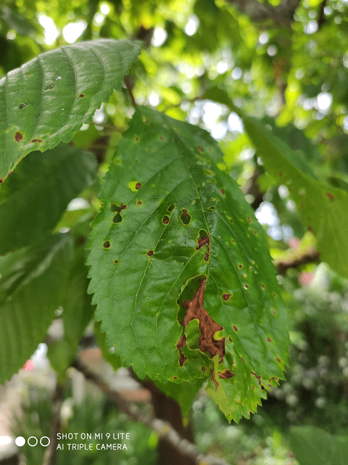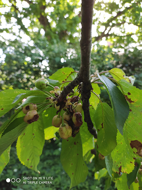 La semaine dernière, et suite à une semaine de forte pluie, j'ai remarqué que les feuilles étaient criblés de trous et de taches brunes, et que les jeunes cerises pas encore mur pourrissaient sur l'arbre, certaines présentant des traces de moisissures.