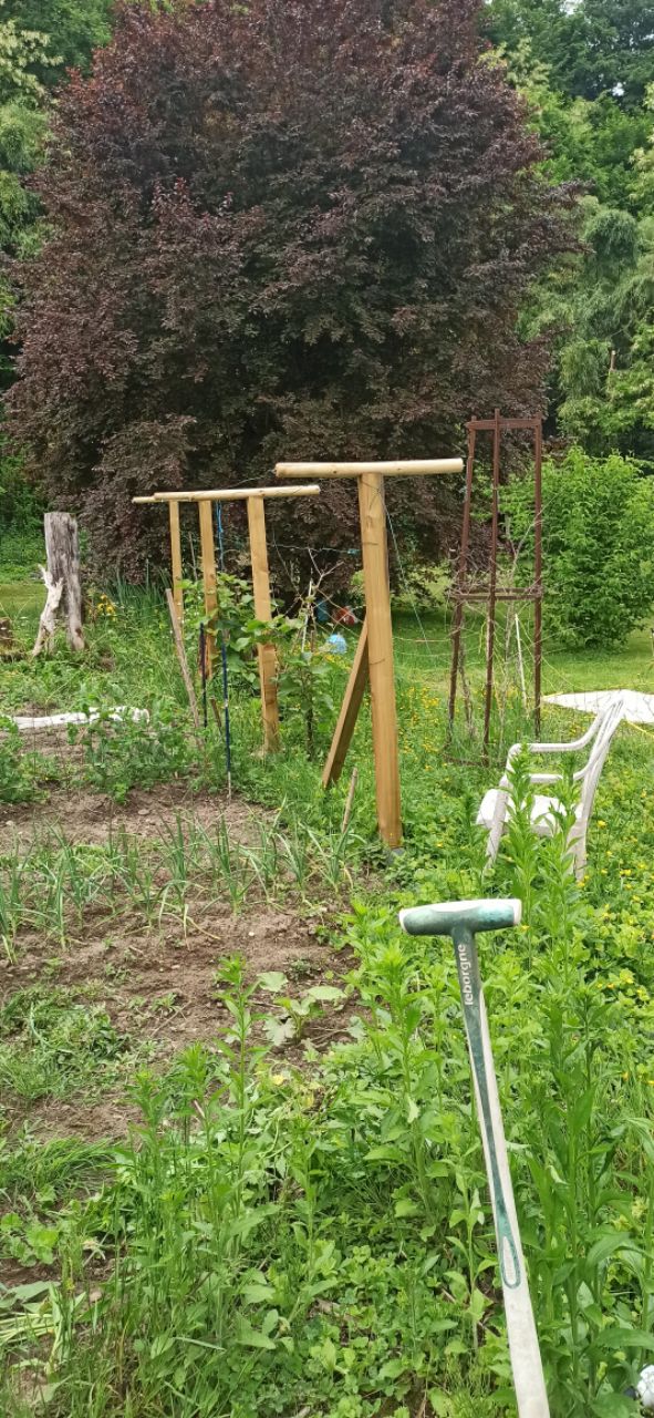 Tu pourrais faire cela (poteaux achetés dans un magasin de bricolage), en fixant les poteaux verticaux aux poteaux en ciment : il n'y a pas d'urgence le système peut être installé l'an prochain, après une première année de reprise des plants