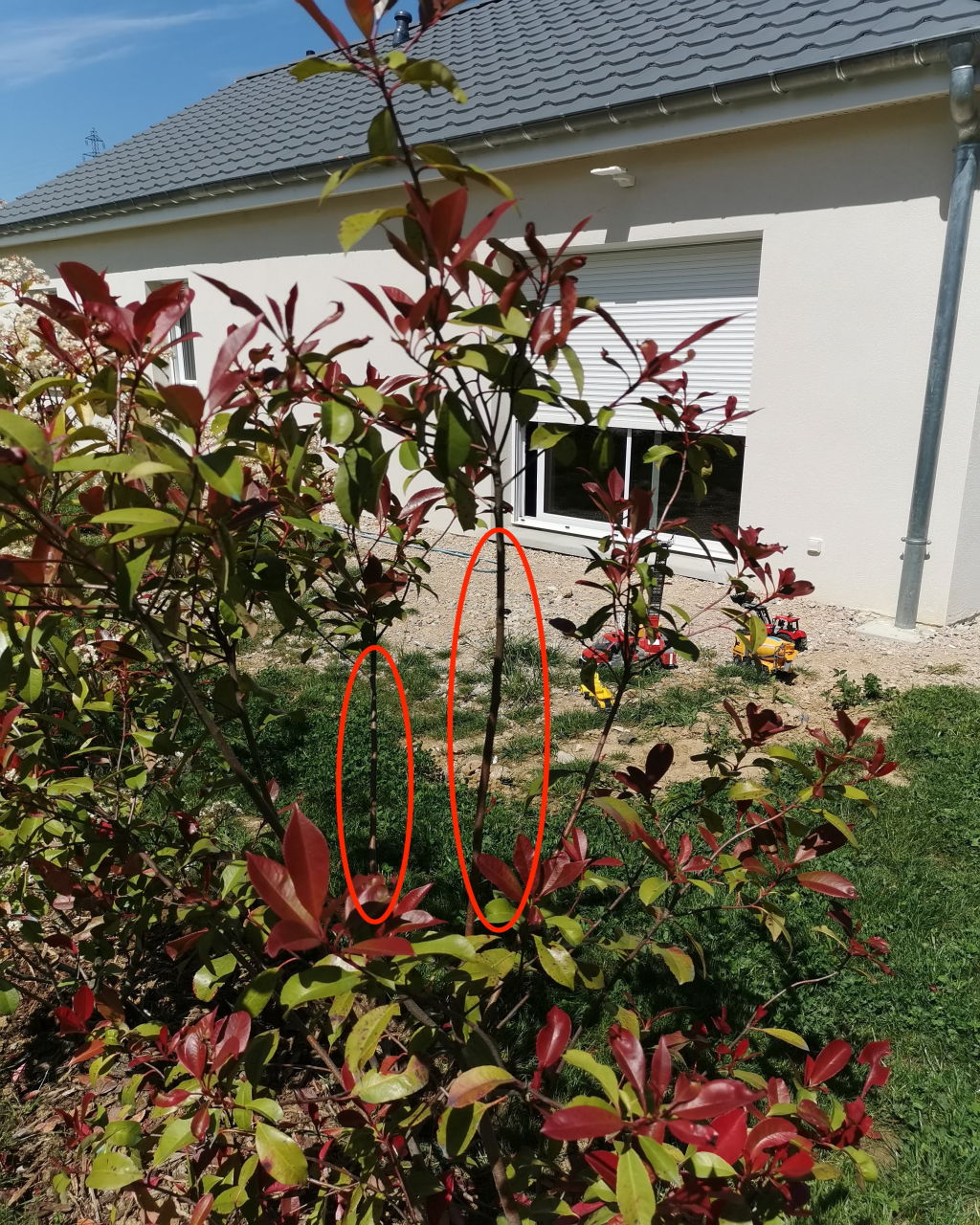 J'ai planté l'année dernière des photinias, ils ont bien grandi et j'ai plein de branches qui n'ont plus de feuilles excepté en haut. Voir photo.