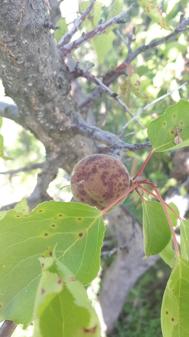 Il y a des petits points noirs sur le feuilles, qui rappelle la criblure à cornélyum, mais je ne suis pas sur que se soit cela. Il y en a aussi sur les fruits, et ça varie de rien du tout à un fruit couvert de point. Autre fait étrange, la partie haute de l'arbre est intacte, alors que le bas, surtout les fruits, est très attaquée.