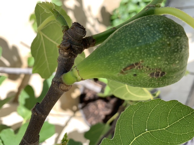 Sur les figues attaquées et abîmées, Peut-être une attaque de teigne ? Est-ce que tu as observé ces chenilles vertes sur tes feuilles, elles font des espèces de toile blanchâtres et se mettent dessous, tu peux distinguer leur toutes petites crottes, elles mangent les feuilles par endroits. L'année dernière mon dorée en était infesté !