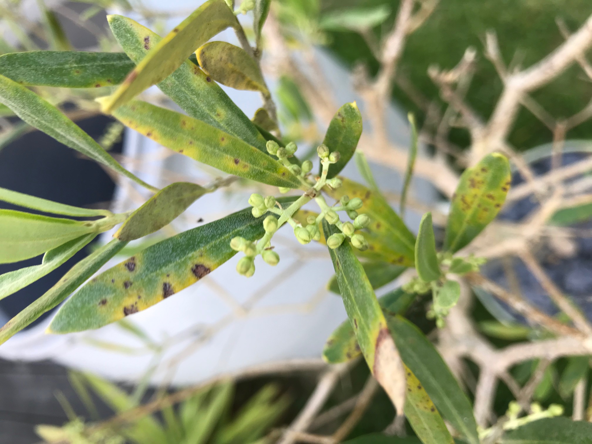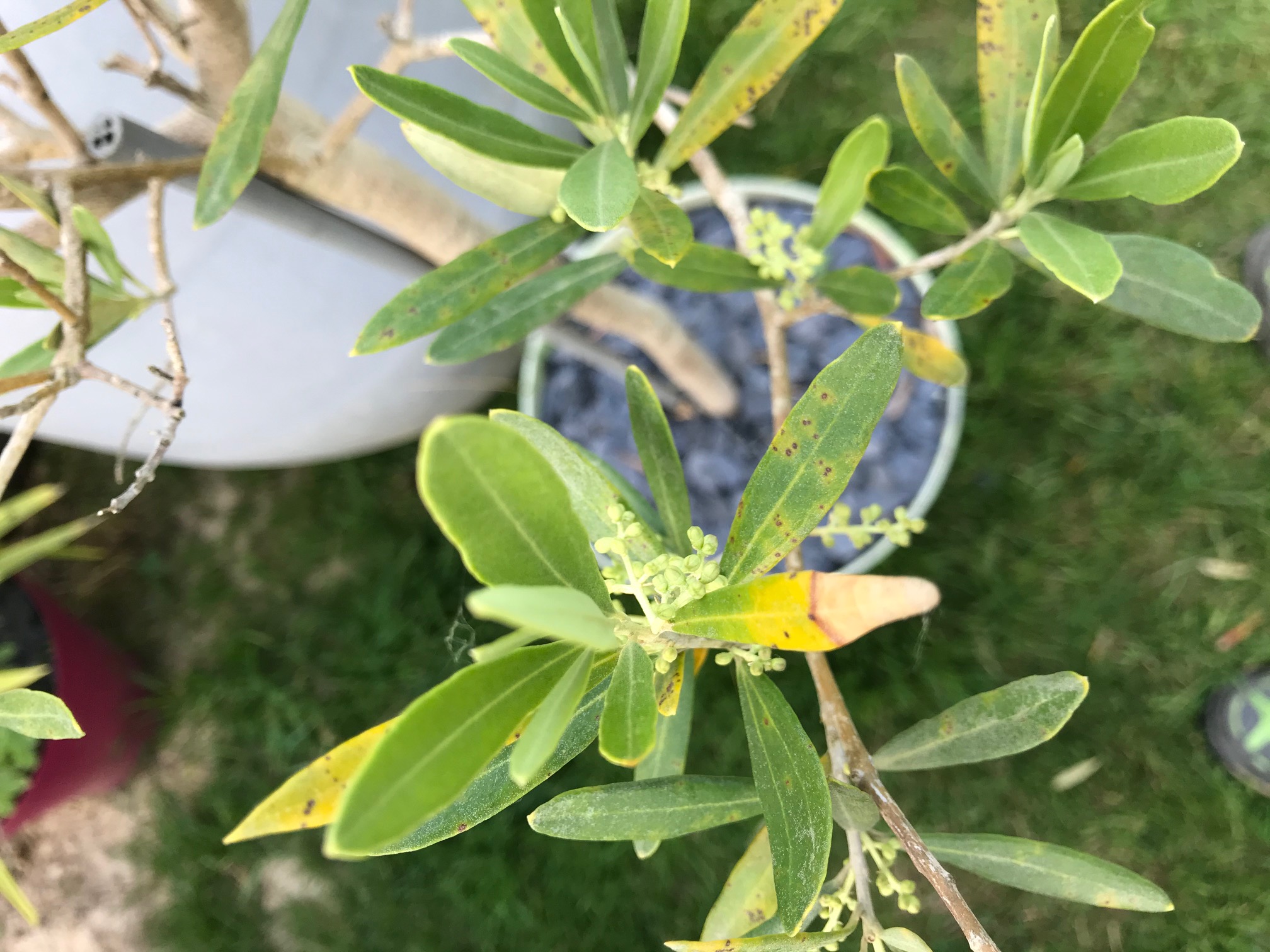 Je souhaiterai un avis/conseil concernent un olivier en pot. Celui ci-dessus a beaucoup de nouvelle pousses, nouvelles feuilles et fleurs ... mais en même temps, les feuilles les plus anciennes sont tâchées et jaunissent ... puis tombent.