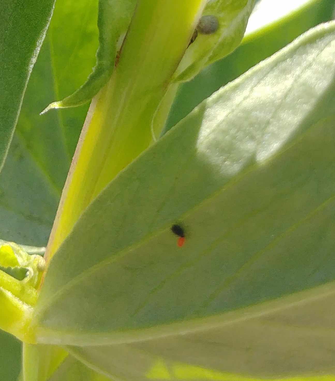 D'abord, identification, quand même : sur mes plants de fève, il y a une invasion de pucerons noirs, et j'y ai mis des coccinelles, j'observe donc la situation avec attention. Ces derniers jours, je vois de tout petits grains rouge isolés (oeufs, je présume), parfois avec un mini insecte noir dessus. Qu'est-ce ? J'ai beau chercher sur Internet, je ne trouve pas de telles images pour des oeufs de pucerons…