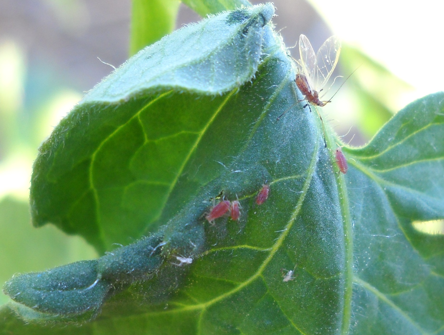 Ici, sur feuille de tomates, en face d'un puceron ailé, adulte